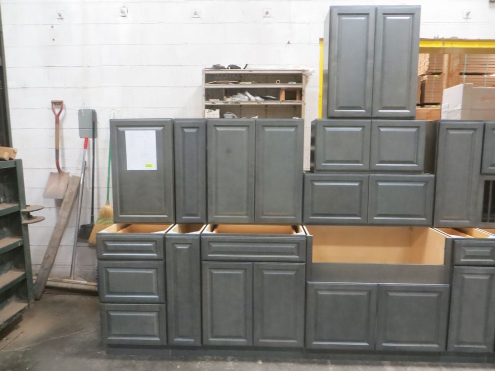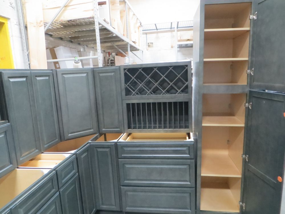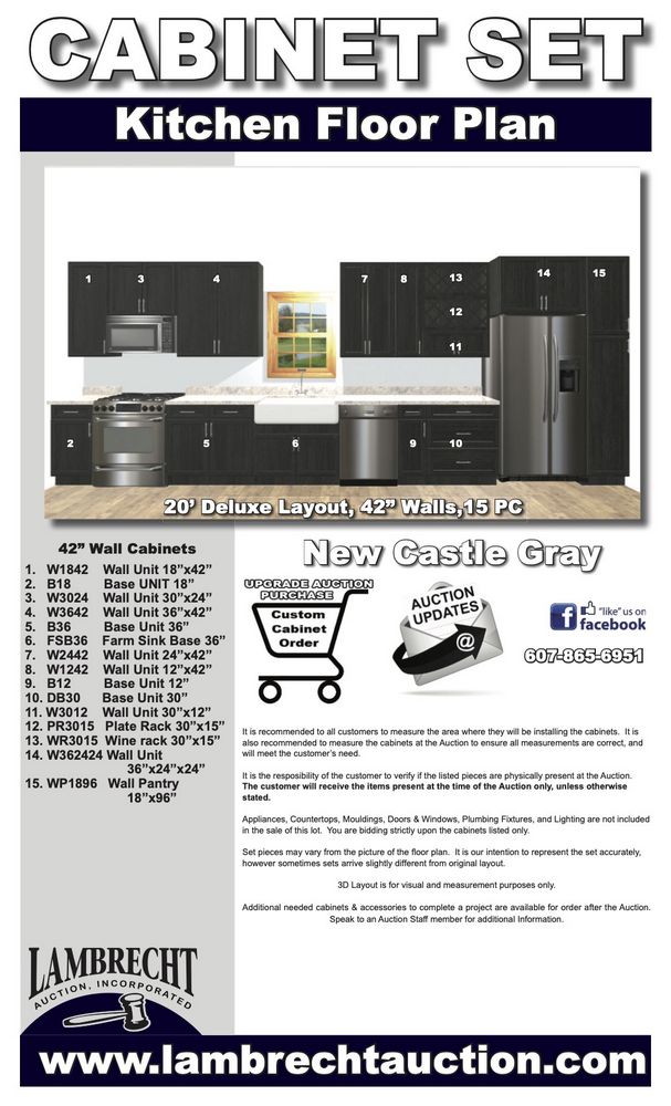 Newcastle Gray Kitchen Cabinet Set 20'. Modified Deluxe Layout, 42" Walls, By GHI. ADDITIONAL CABINETS ARE UNAVAILABLE BECAUSE THIS PRODUCT LINE IS DISCONTINUED. 3/4” Solid Maple Face Frame -Solid Maple Raised Panel Doors and Drawer Fronts -1/2” Plywood Box Construction with Wood Veneer Interiors and Exteriors -3/4” plywood Shelves -Full overlay Doors and Drawer Fronts -Solid Wood Dovetail Drawer Box -Soft Close Full Extension Drawer Gliders -Hand Rubbed Glaze -6-Way Adjustable Concealed Hinges -Soft Close. Enclosed in each cabinet set will be a Build Sheet which lists the individual cabinets in each set. As the cabinets are palletized each cabinet will be checked off and signed by our staff member to ensure that the set is complete at the time of pick-up. Please keep this Build Sheet on hand because it will be required if there is an issue with your cabinet set. Cabinet issues will not be addressed without this build sheet.,This is a liquidated product. The Auction Company makes no express or implied representations or warranties of any kind regarding the Product. Any pre-existing retail, wholesale or manufacturer warranties will not transfer with the sale of this Product unless expressly stated otherwise on this page. The Buyer accepts the Product in as-is condition, with all faults. Weight: X. Sold by: Set. Sold as: Quantity X Price. Inventory #: NCG-G 20 W42 DLX MOD