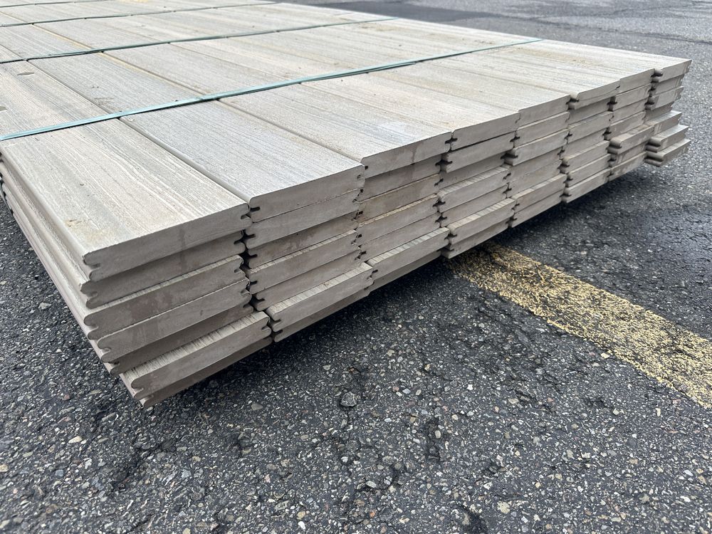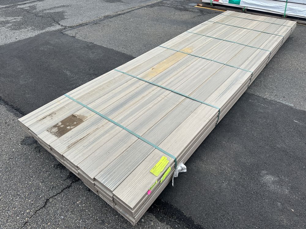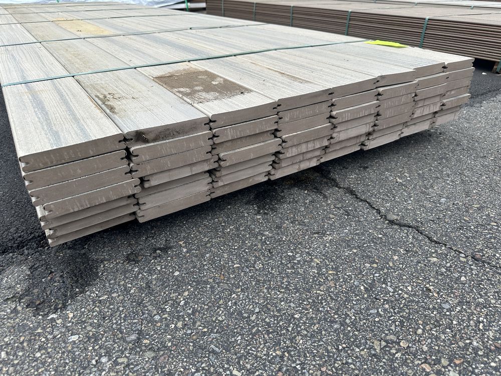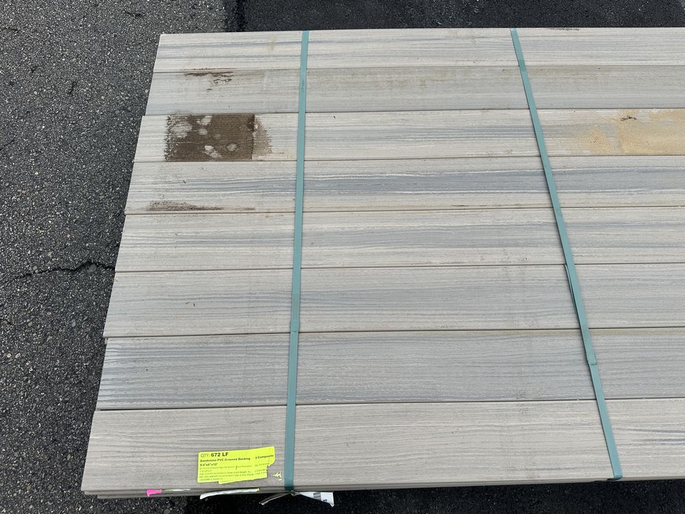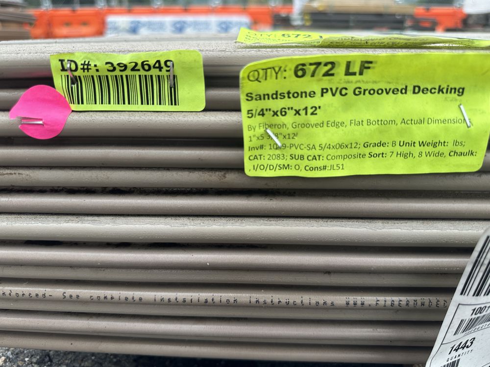 Sandstone PVC Grooved Decking 5/4"x6"x12'. By Fiberon, 56 Total Boards Grooved Edge, Flat Bottom, Actual Dimensions 1"x5 3/8"x12' Grade: B,This is a liquidated product. The Auction Company makes no express or implied representations or warranties of any kind regarding the Product. Any pre-existing retail, wholesale or manufacturer warranties will not transfer with the sale of this Product unless expressly stated otherwise on this page. The Buyer accepts the Product in as-is condition, with all faults. Weight: x. Sold by: Linear Foot. Sold as: Quantity X Price. Inventory #: 1019-PVC-SA 5/4x06x12