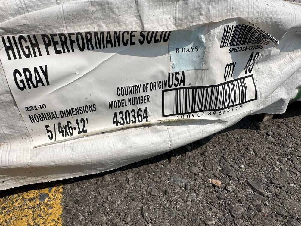 Gray Composite Decking 5/4"x6"x12'. PVC Wrapped, 48 Boards Total, Scalloped Bottom, Flat Edge, Actual Dimensions 1"x5 1/4"x12' Grade: B,This is a liquidated product. The Auction Company makes no express or implied representations or warranties of any kind regarding the Product. Any pre-existing retail, wholesale or manufacturer warranties will not transfer with the sale of this Product unless expressly stated otherwise on this page. The Buyer accepts the Product in as-is condition, with all faults. Weight: x. Sold by: Linear Foot. Sold as: Quantity X Price. Inventory #: 1011-GRY 5/4x06x12