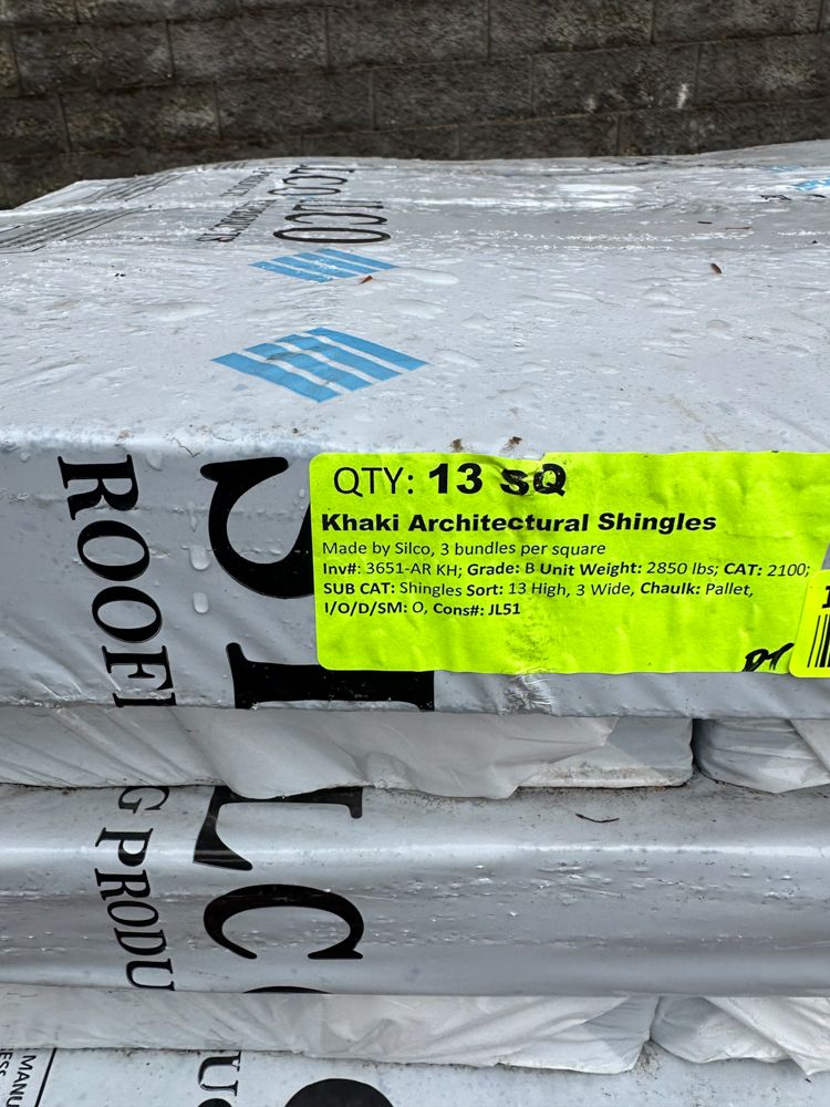 Khaki Architectural Shingles. Made By Silco, 3 Bundles Per Square Grade: B,This is a liquidated product. The Auction Company makes no express or implied representations or warranties of any kind regarding the Product. Any pre-existing retail, wholesale or manufacturer warranties will not transfer with the sale of this Product unless expressly stated otherwise on this page. The Buyer accepts the Product in as-is condition, with all faults. Weight: 2850. Sold by: Bundle. Sold as: Quantity X Price. Inventory #: 3651-AR KH