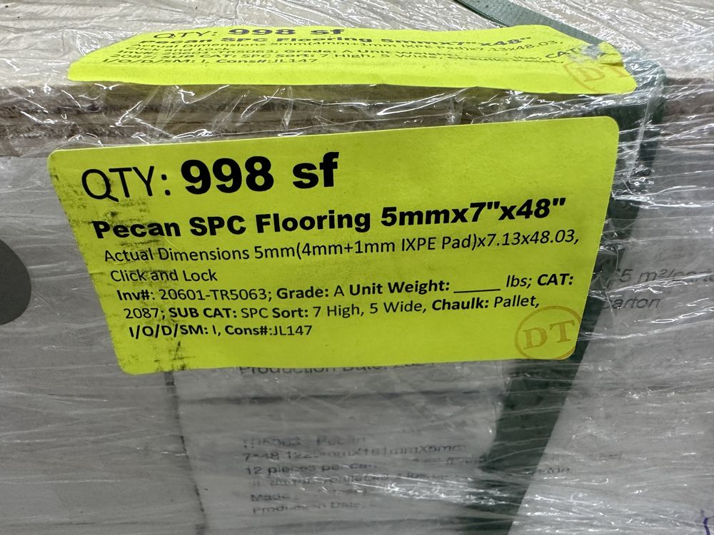 Pecan SPC Flooring 5mmx7"x48". Actual Dimensions 5mm(4mm+1mm IXPE Pad)x7.13x48.03, Click And Lock, 12 Pieces Per Box, 28.52 Square Foot, 35 Cartons Per Pallet, Grade: A,This is a liquidated product. The Auction Company makes no express or implied representations or warranties of any kind regarding the Product. Any pre-existing retail, wholesale or manufacturer warranties will not transfer with the sale of this Product unless expressly stated otherwise on this page. The Buyer accepts the Product in as-is condition, with all faults. Weight: X. Sold by: Square Foot. Sold as: Quantity X Price. Inventory #: 20601-TR5063