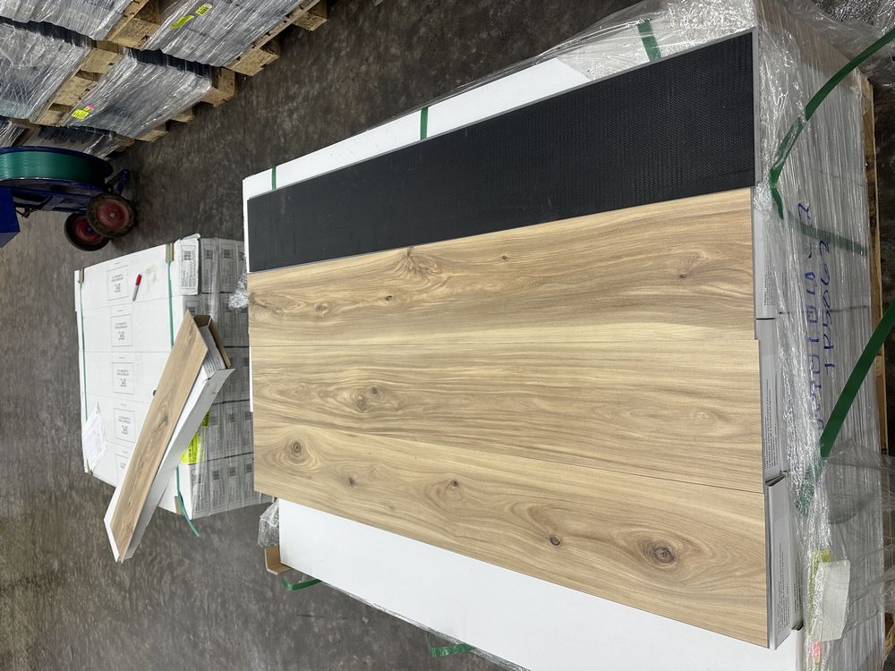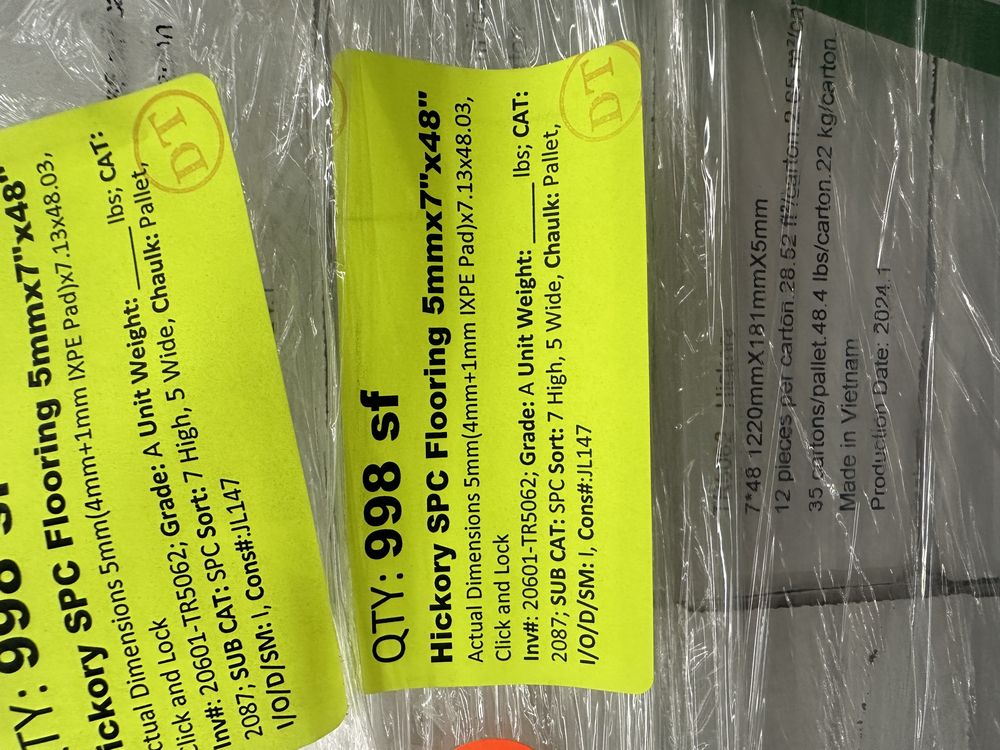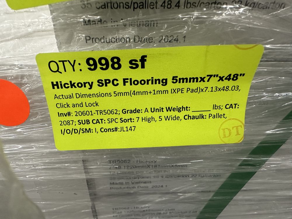 Hickory SPC Flooring 5mmx7"x48". Actual Dimensions 5mm(4mm+1mm IXPE Pad)x7.13x48.03, Click and Lock, 12 pieces per carton, 35 cartons per pallet Grade: A,This is a liquidated product. The Auction Company makes no express or implied representations or warranties of any kind regarding the Product. Any pre-existing retail, wholesale or manufacturer warranties will not transfer with the sale of this Product unless expressly stated otherwise on this page. The Buyer accepts the Product in as-is condition, with all faults. Weight: x. Sold by: Square Foot. Sold as: Quantity X Price. Inventory #: 20601-TR5062