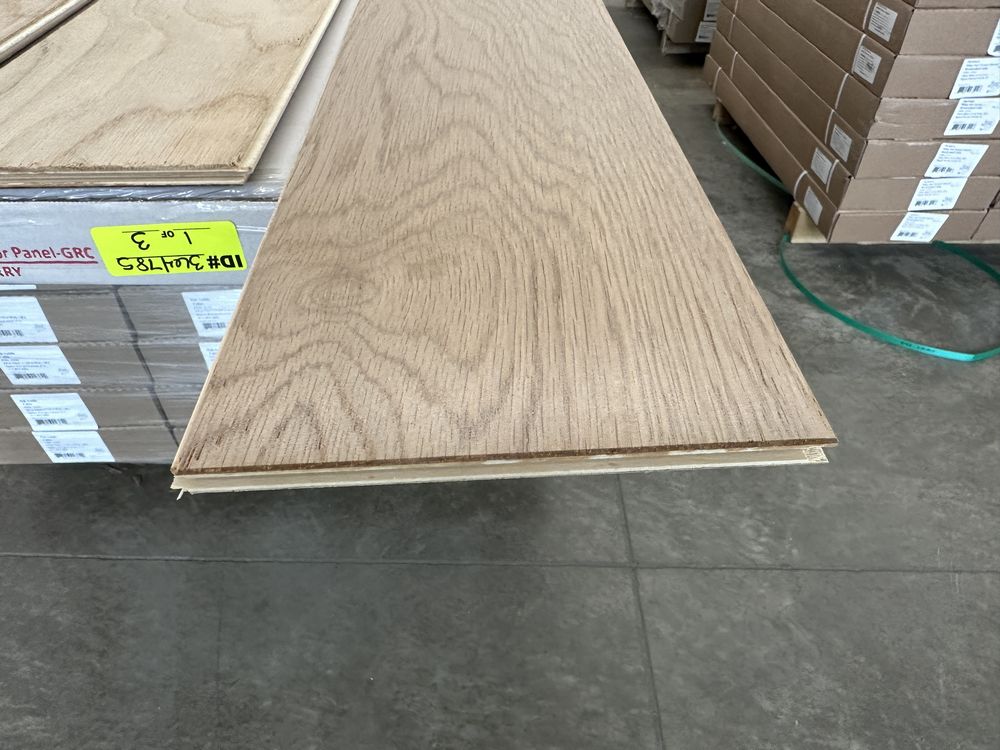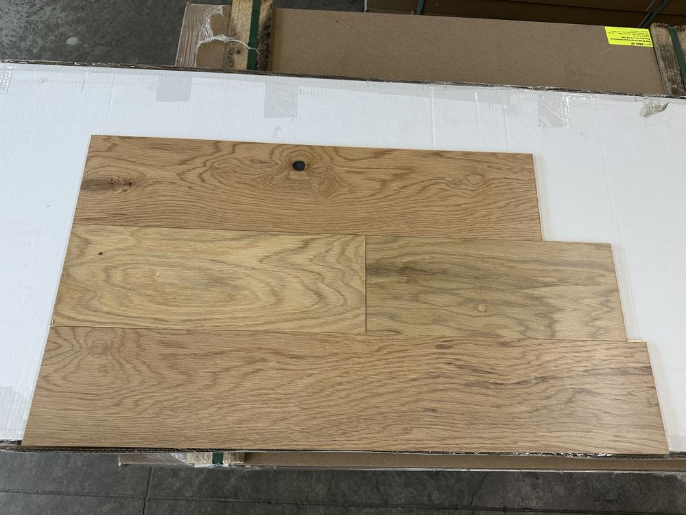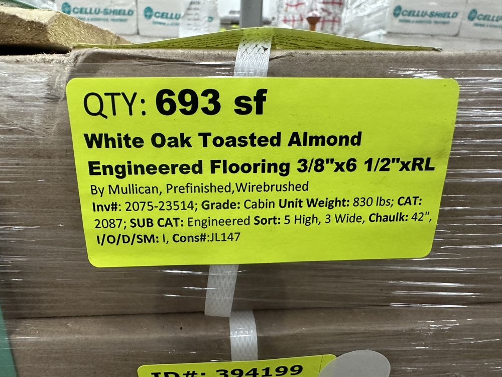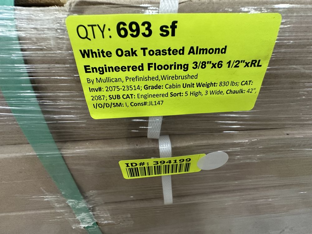 White Oak Toasted Almond Engineered Hardwood Flooring 3/8"x6 1/2"xRL. By Mullican, Pre-finished, Wire brushed, 33 Square Feet per Box, 21 Boxes, Grade: Cabin Cabin/Utility/Tavern Grade: This flooring product will have varying wood characteristics and colors to include streaks, deeper knots and burls, small splits, wormholes, and even marks during the milling process such as machine burns. It may also have a large variance in color and grain patterns. The boards are typically 10” to 30” with an average board length of 16”. It is usually packaged in mini bundles of 18-20 sf per bundle. It is ok for 5” wide to be heavier in shorter pieces. Cabin grade is a stable, installable product but please account up to 10%-20% waste.,This is a liquidated product. The Auction Company makes no express or implied representations or warranties of any kind regarding the Product. Any pre-existing retail, wholesale or manufacturer warranties will not transfer with the sale of this Product unless expressly stated otherwise on this page. The Buyer accepts the Product in as-is condition, with all faults. Weight: 830. Sold by: Square Foot. Sold as: Quantity X Price. Inventory #: 2075-23514