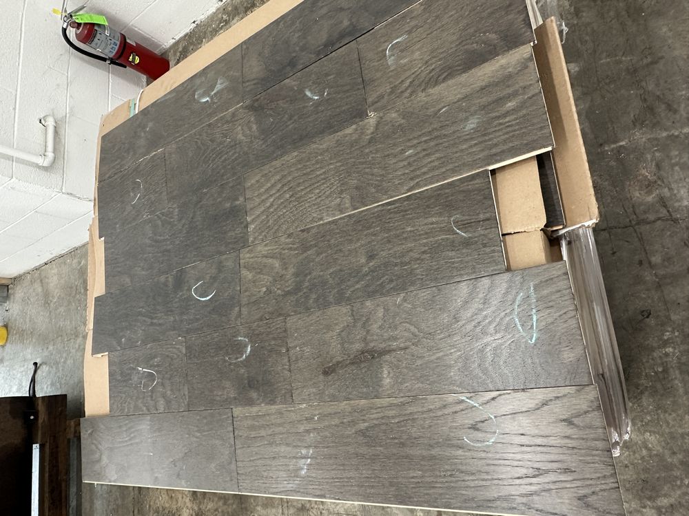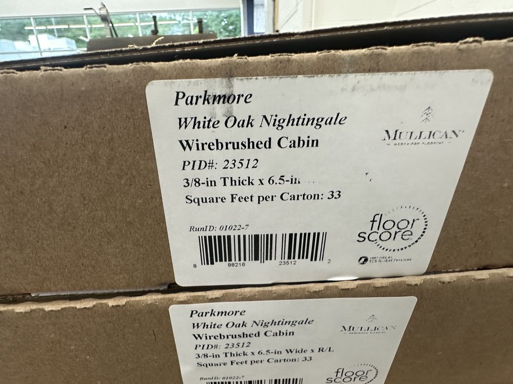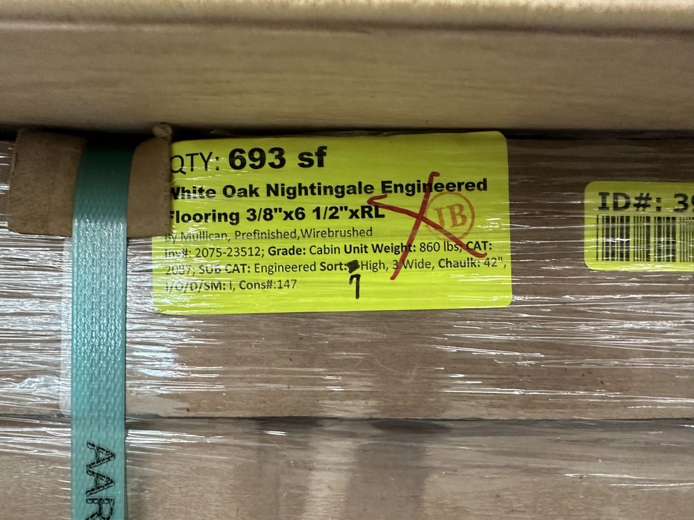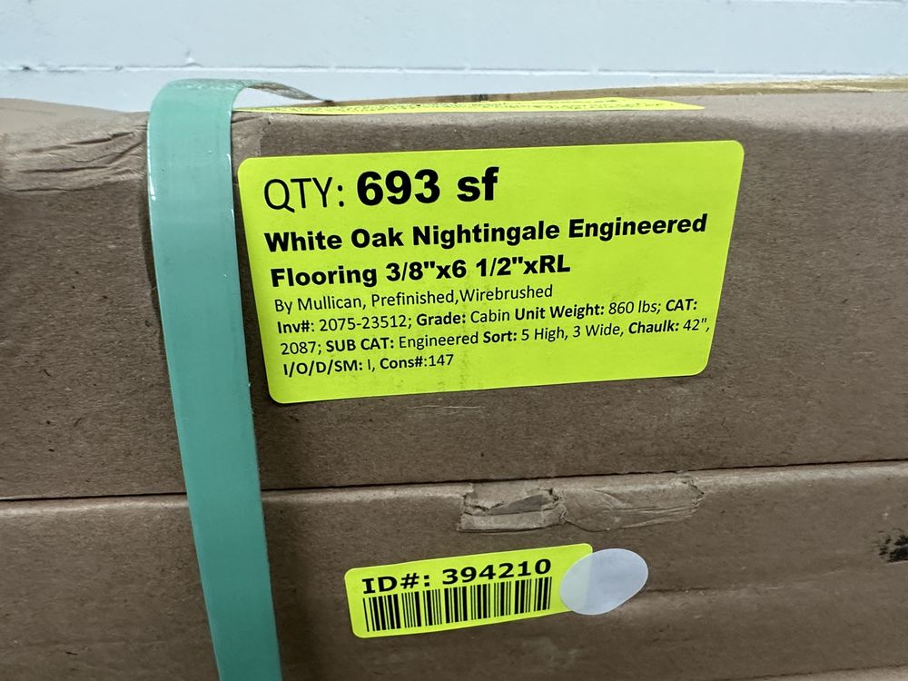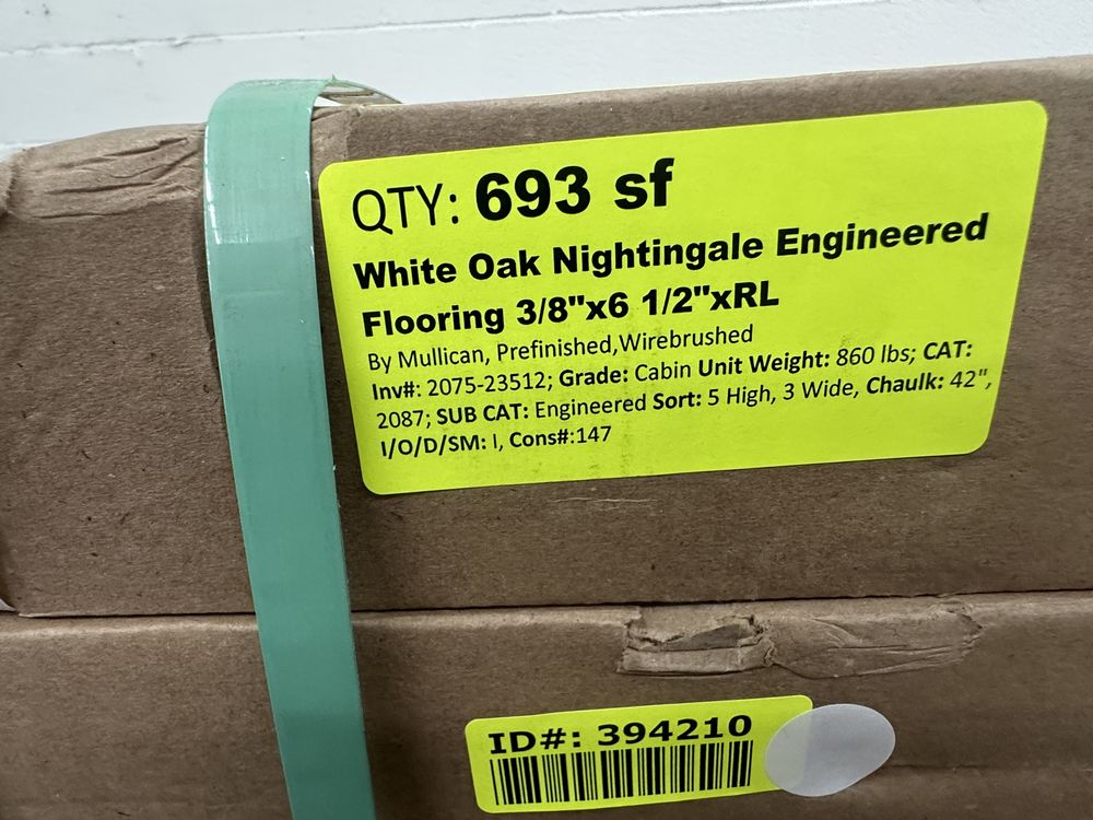 White Oak Nightingale Engineered Flooring 3/8"x6 1/2"xRL. By Mullican, Pre-finished, Wire brushed, 33 Square Feet per Box, 21 Boxes, Grade: Cabin Cabin/Utility/Tavern Grade: This flooring product will have varying wood characteristics and colors to include streaks, deeper knots and burls, small splits, wormholes, and even marks during the milling process such as machine burns. It may also have a large variance in color and grain patterns. The boards are typically 10” to 30” with an average board length of 16”. It is usually packaged in mini bundles of 18-20 sf per bundle. It is ok for 5” wide to be heavier in shorter pieces. Cabin grade is a stable, installable product but please account up to 10%-20% waste.,This is a liquidated product. The Auction Company makes no express or implied representations or warranties of any kind regarding the Product. Any pre-existing retail, wholesale or manufacturer warranties will not transfer with the sale of this Product unless expressly stated otherwise on this page. The Buyer accepts the Product in as-is condition, with all faults. Weight: 860. Sold by: Square Foot. Sold as: Quantity X Price. Inventory #: 2075-23512