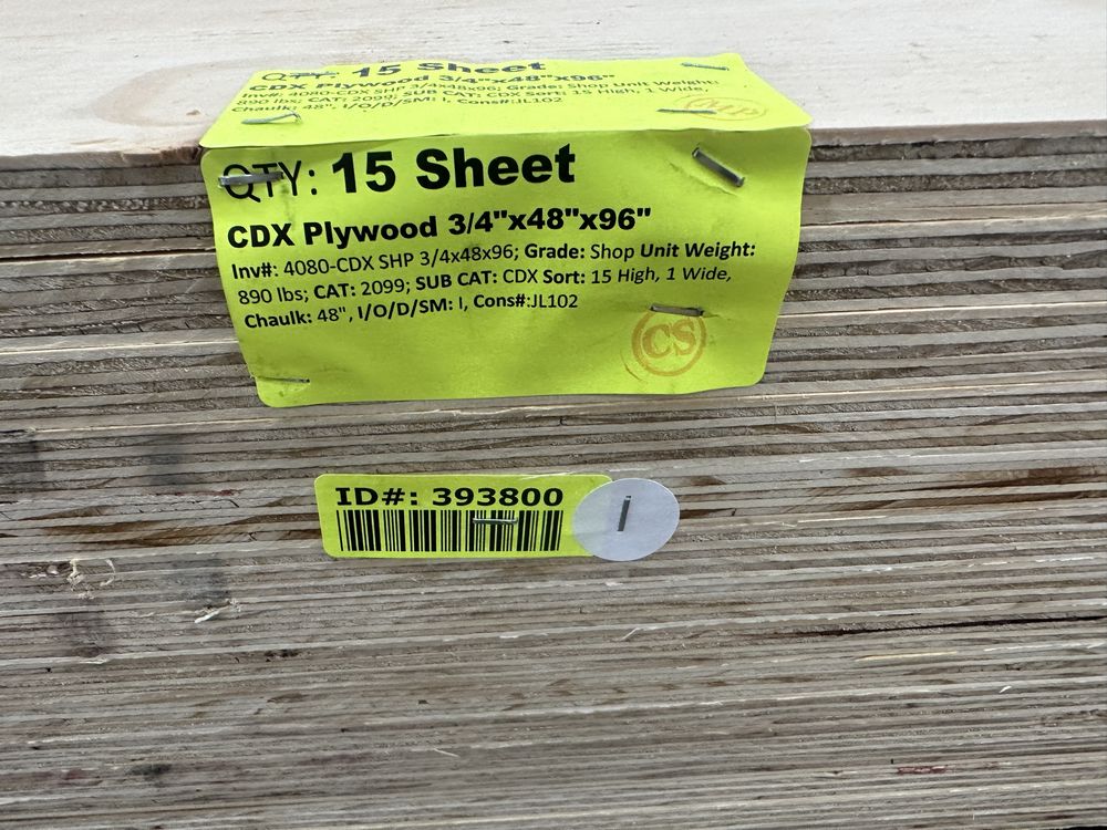 CDX Plywood 3/4"x48"x96". Grade: Shop,This is a liquidated product. The Auction Company makes no express or implied representations or warranties of any kind regarding the Product. Any pre-existing retail, wholesale or manufacturer warranties will not transfer with the sale of this Product unless expressly stated otherwise on this page. The Buyer accepts the Product in as-is condition, with all faults. Weight: 890. Sold by: Sheet. Sold as: Quantity X Price. Inventory #: 4080-CDX SHP 3/4x48x96