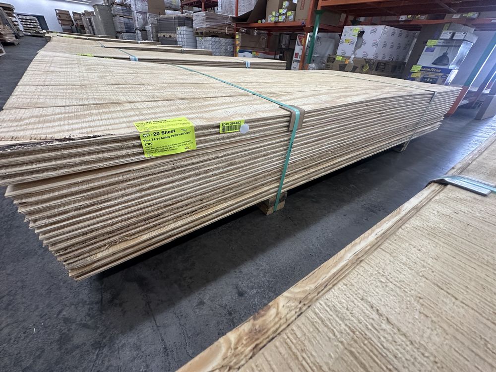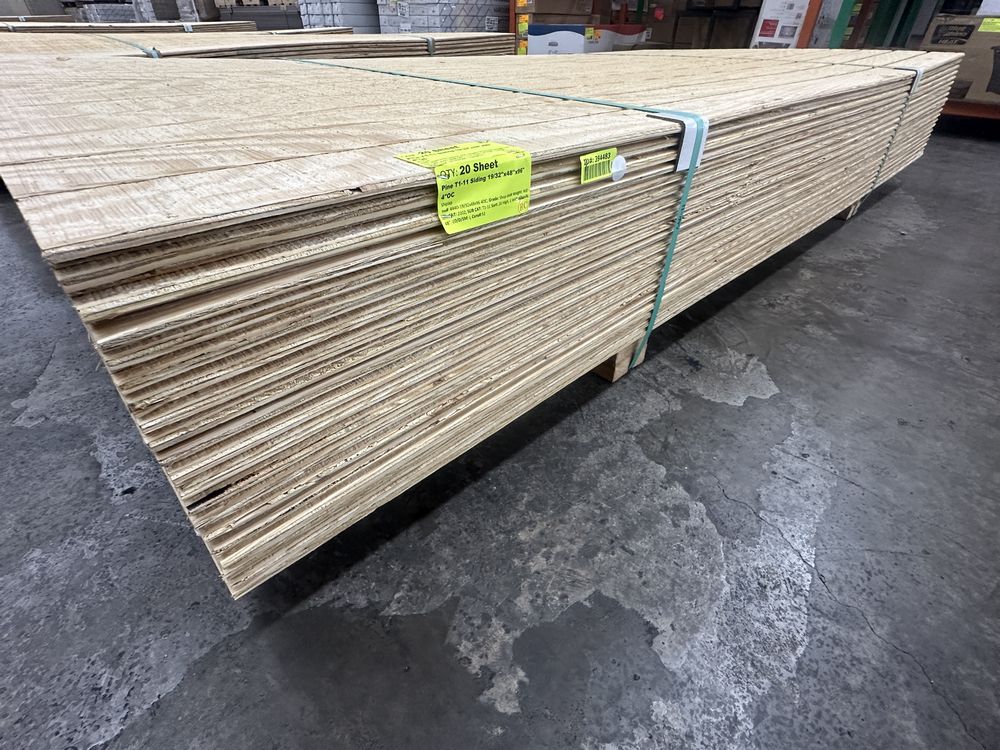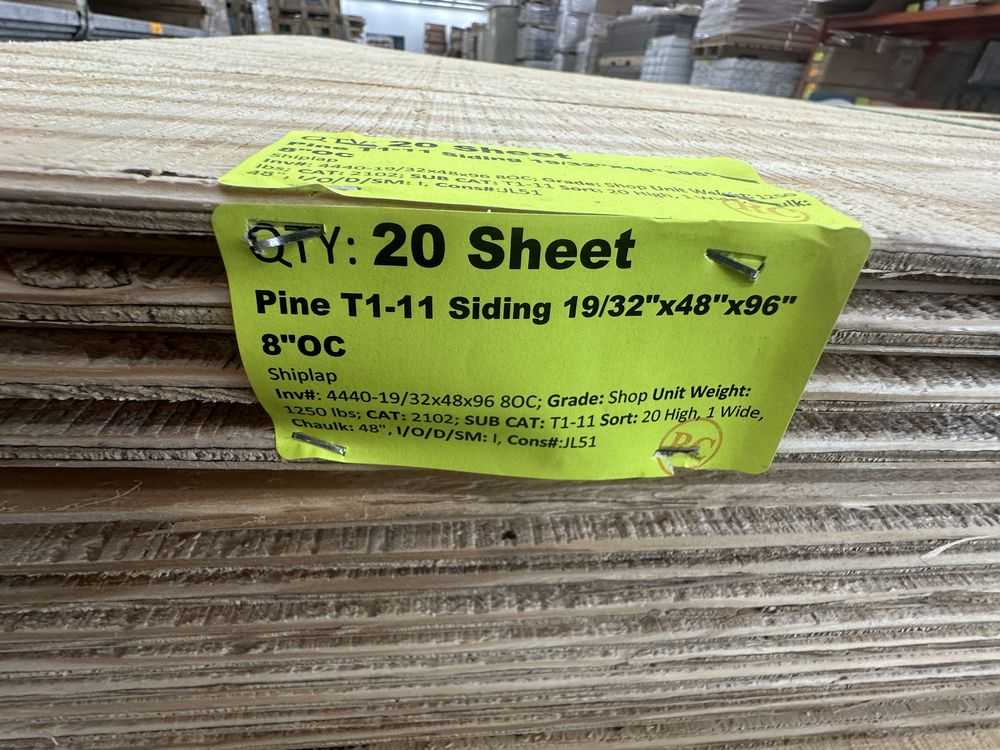 Pine T1-11 Siding 19/32"x48"x96" 4"OC. Shiplap, Grade: Shop,This is a liquidated product. The Auction Company makes no express or implied representations or warranties of any kind regarding the Product. Any pre-existing retail, wholesale or manufacturer warranties will not transfer with the sale of this Product unless expressly stated otherwise on this page. The Buyer accepts the Product in as-is condition, with all faults. Weight: 900. Sold by: Sheet. Sold as: Quantity X Price. Inventory #: 4440-19/32x48x96 4OC