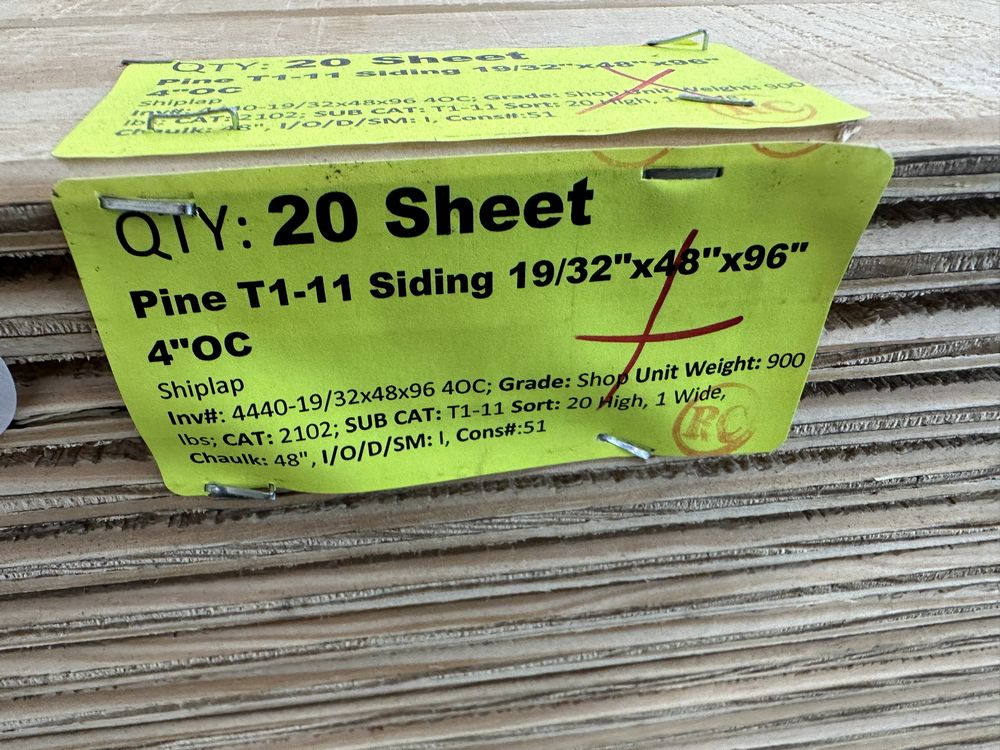 Pine T1-11 Siding 19/32"x48"x96"4"OC. Shiplap Grade: Shop,This is a liquidated product. The Auction Company makes no express or implied representations or warranties of any kind regarding the Product. Any pre-existing retail, wholesale or manufacturer warranties will not transfer with the sale of this Product unless expressly stated otherwise on this page. The Buyer accepts the Product in as-is condition, with all faults. Weight: 900. Sold by: Sheet. Sold as: Quantity X Price. Inventory #: 4440-19/32x48x96 4OC