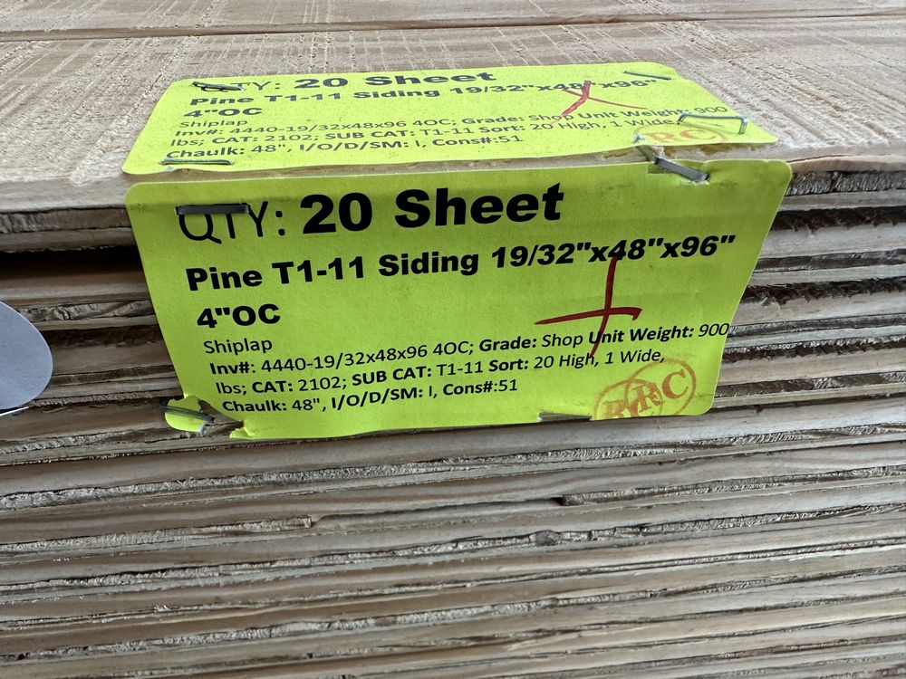 Pine T1-11 Siding 19/32"x48"x96"4"OC. Shiplap Grade: Shop,This is a liquidated product. The Auction Company makes no express or implied representations or warranties of any kind regarding the Product. Any pre-existing retail, wholesale or manufacturer warranties will not transfer with the sale of this Product unless expressly stated otherwise on this page. The Buyer accepts the Product in as-is condition, with all faults. Weight: 900. Sold by: Sheet. Sold as: Quantity X Price. Inventory #: 4440-19/32x48x96 4OC