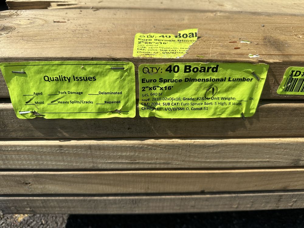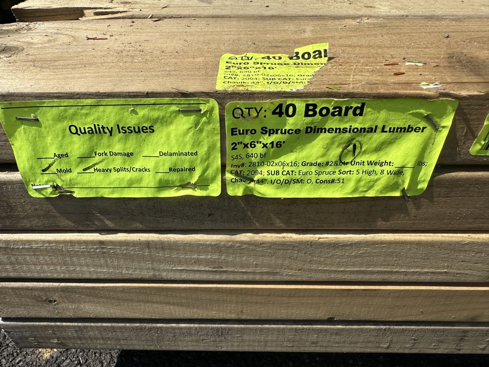 Euro Spruce Dimensional Lumber 2"x6"x16' ** SEE DESCRIPTION**. S4S, 640 Board Foot, Grade: #2&BTR ** Mold, Heavy Splits/Cracks, SEE PHOTOS**,This is a liquidated product. The Auction Company makes no express or implied representations or warranties of any kind regarding the Product. Any pre-existing retail, wholesale or manufacturer warranties will not transfer with the sale of this Product unless expressly stated otherwise on this page. The Buyer accepts the Product in as-is condition, with all faults. Weight: x. Sold by: Board. Sold as: Quantity X Price. Inventory #: 2810-02x06x16