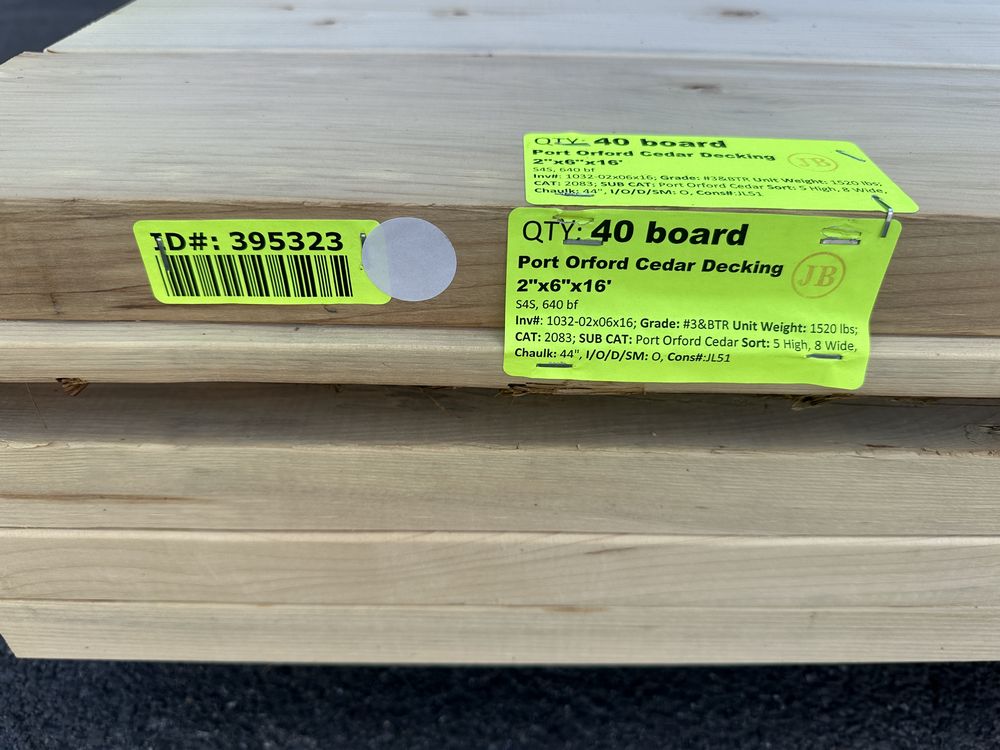 Port Orford Cedar Decking 2"x6"x16'. S4S, 640 Board Foot Grade: #3BTR,This is a liquidated product. The Auction Company makes no express or implied representations or warranties of any kind regarding the Product. Any pre-existing retail, wholesale or manufacturer warranties will not transfer with the sale of this Product unless expressly stated otherwise on this page. The Buyer accepts the Product in as-is condition, with all faults. Weight: 1520. Sold by: Board. Sold as: Quantity X Price. Inventory #: 1032-02x06x16