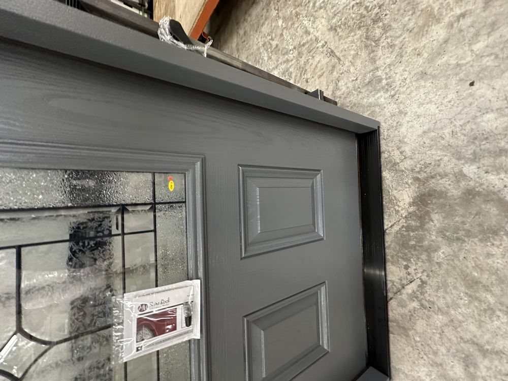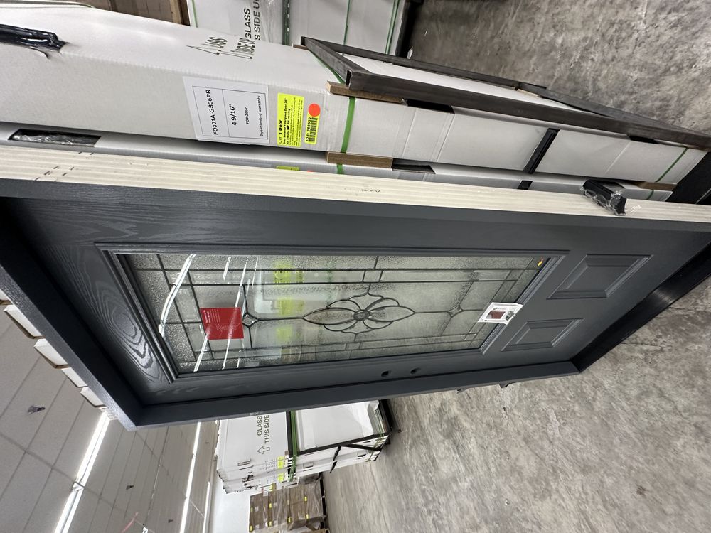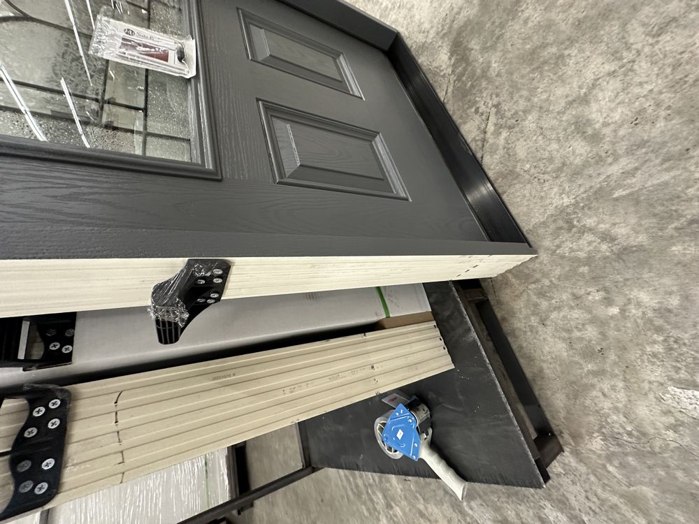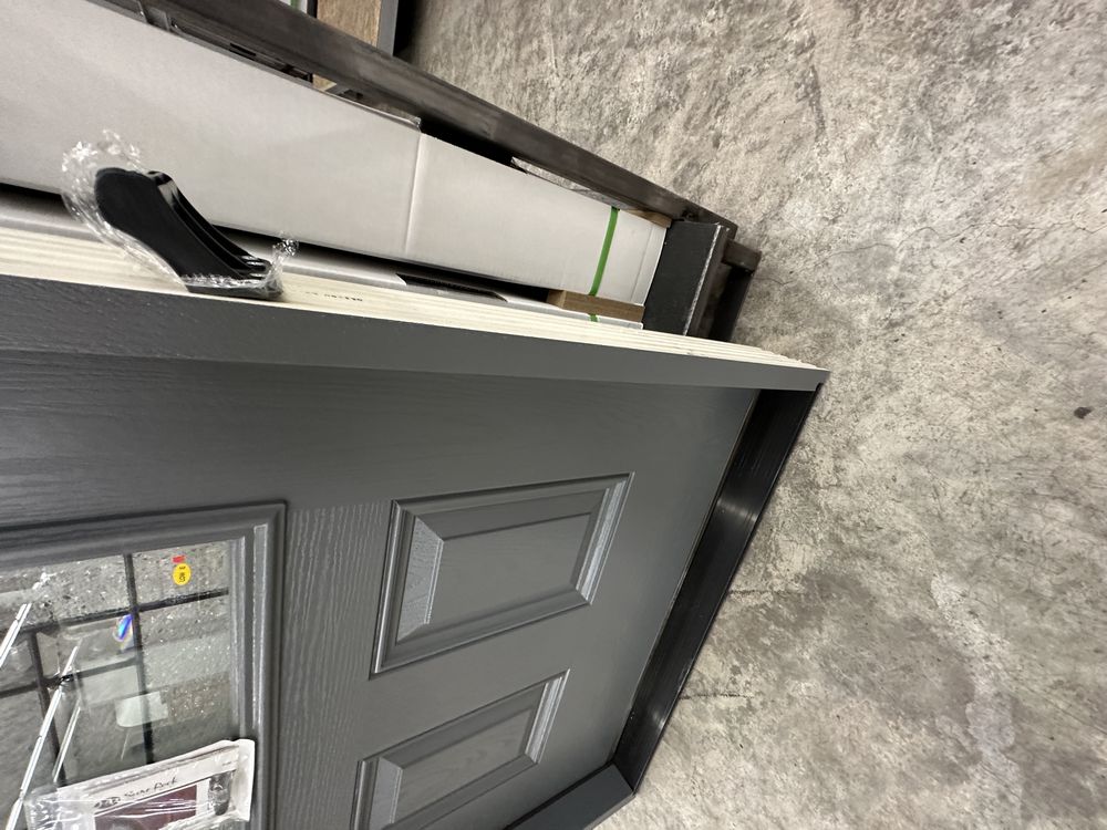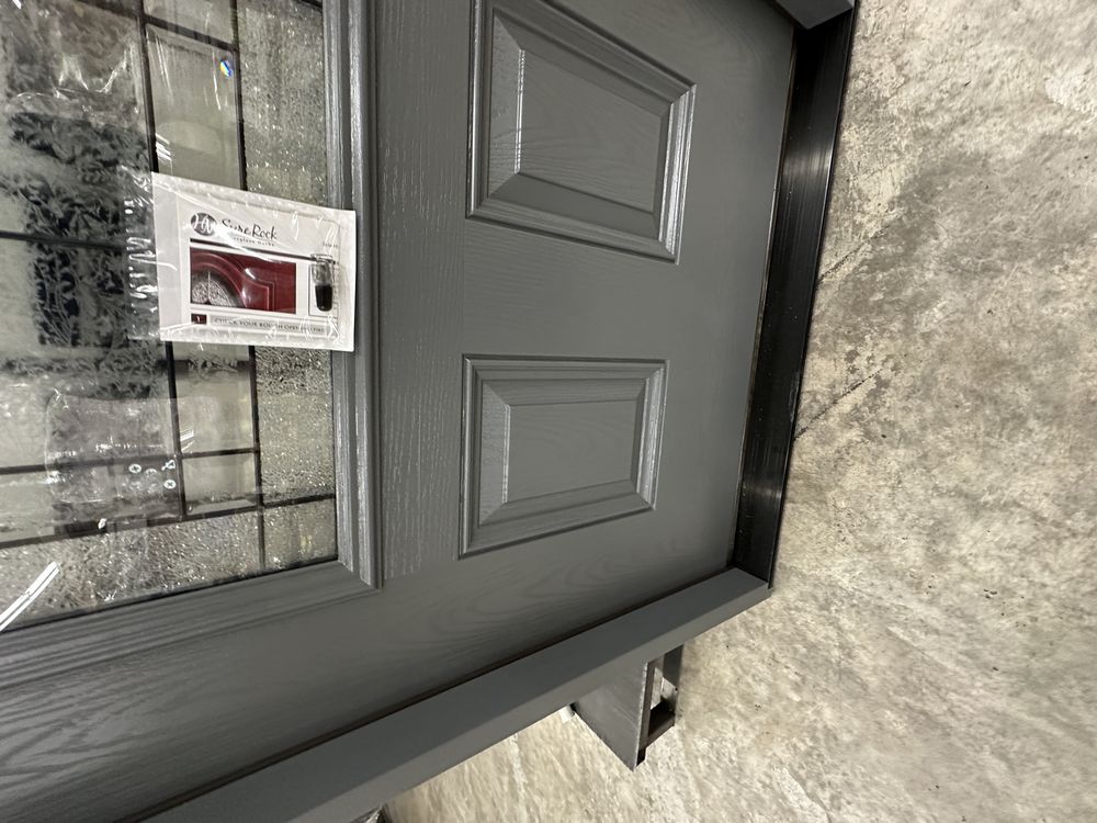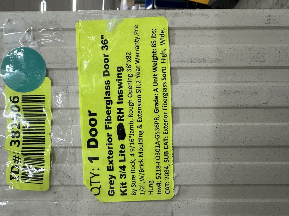 Gray Exterior Fiberglass Door 36" Kit 3/4 Lite RH Inswing. By Sure Rock, 4 9/16" Jamb, Rough Opening 38"x82 1/2", W/Brick Moulding & Extension Sill, 2 Year Warranty, Pre Hung, Grade: A,This is a liquidated product. The Auction Company makes no express or implied representations or warranties of any kind regarding the Product. Any pre-existing retail, wholesale or manufacturer warranties will not transfer with the sale of this Product unless expressly stated otherwise on this page. The Buyer accepts the Product in as-is condition, with all faults. Weight: 85 lbs. Sold by: Door. Sold as: Quantity X Price. Inventory #: 5218-FO301A-GS36PR