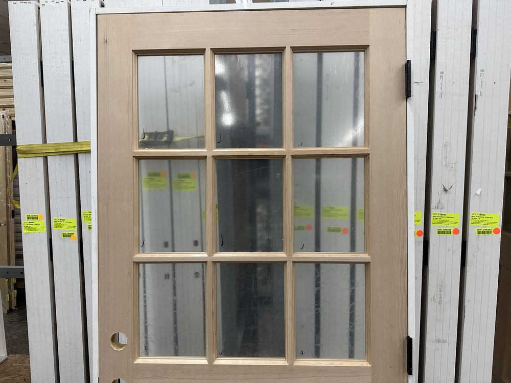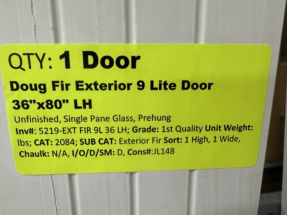 Doug Fir Exterior 9 Lite Door 36"x80" LH. Unfinished, Single Pane Glass, Prehung Grade: 1st Quality,This is a liquidated product. The Auction Company makes no express or implied representations or warranties of any kind regarding the Product. Any pre-existing retail, wholesale or manufacturer warranties will not transfer with the sale of this Product unless expressly stated otherwise on this page. The Buyer accepts the Product in as-is condition, with all faults. Weight: x. Sold by: Door. Sold as: Quantity X Price. Inventory #: 5219-EXT FIR 9L 36 LH