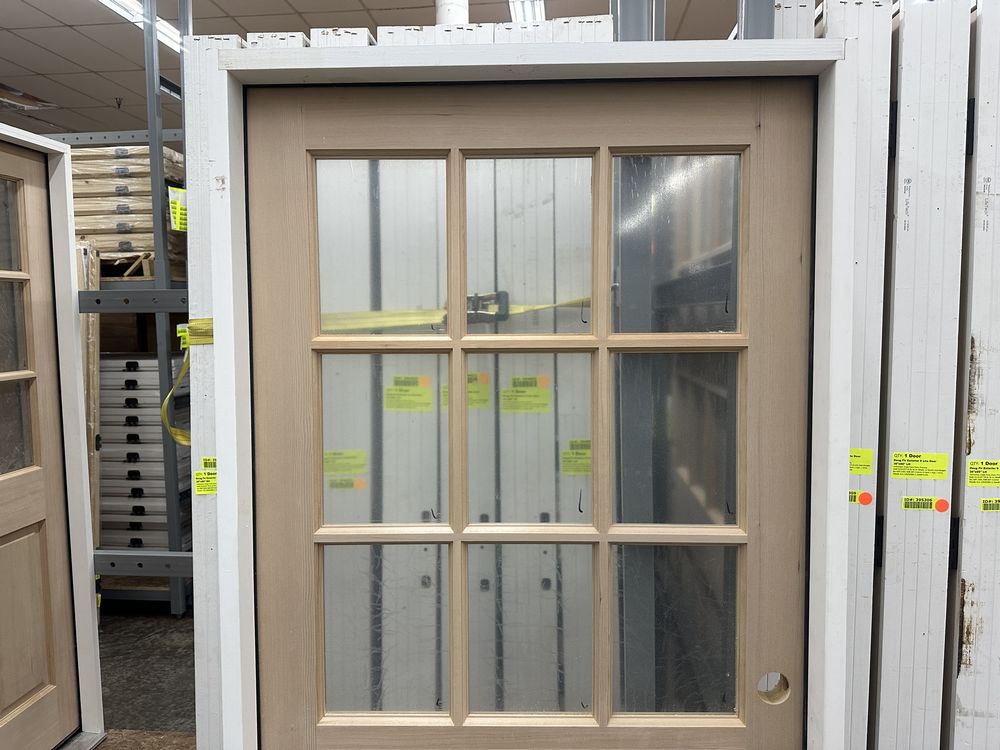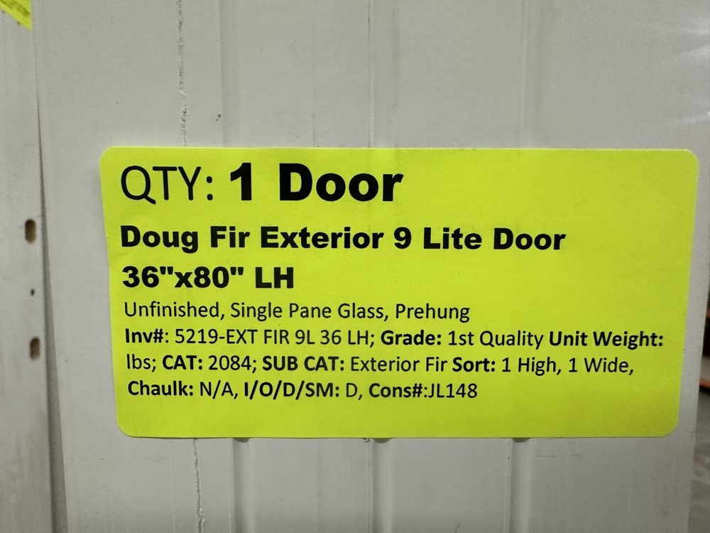 Doug Fir Exterior 9 Lite Door 36"x80" LH. Unfinished, Single Pane Glass, Prehung Grade: 1st Quality,This is a liquidated product. The Auction Company makes no express or implied representations or warranties of any kind regarding the Product. Any pre-existing retail, wholesale or manufacturer warranties will not transfer with the sale of this Product unless expressly stated otherwise on this page. The Buyer accepts the Product in as-is condition, with all faults. Weight: x. Sold by: Door. Sold as: Quantity X Price. Inventory #: 5219-EXT FIR 9L 36 LH