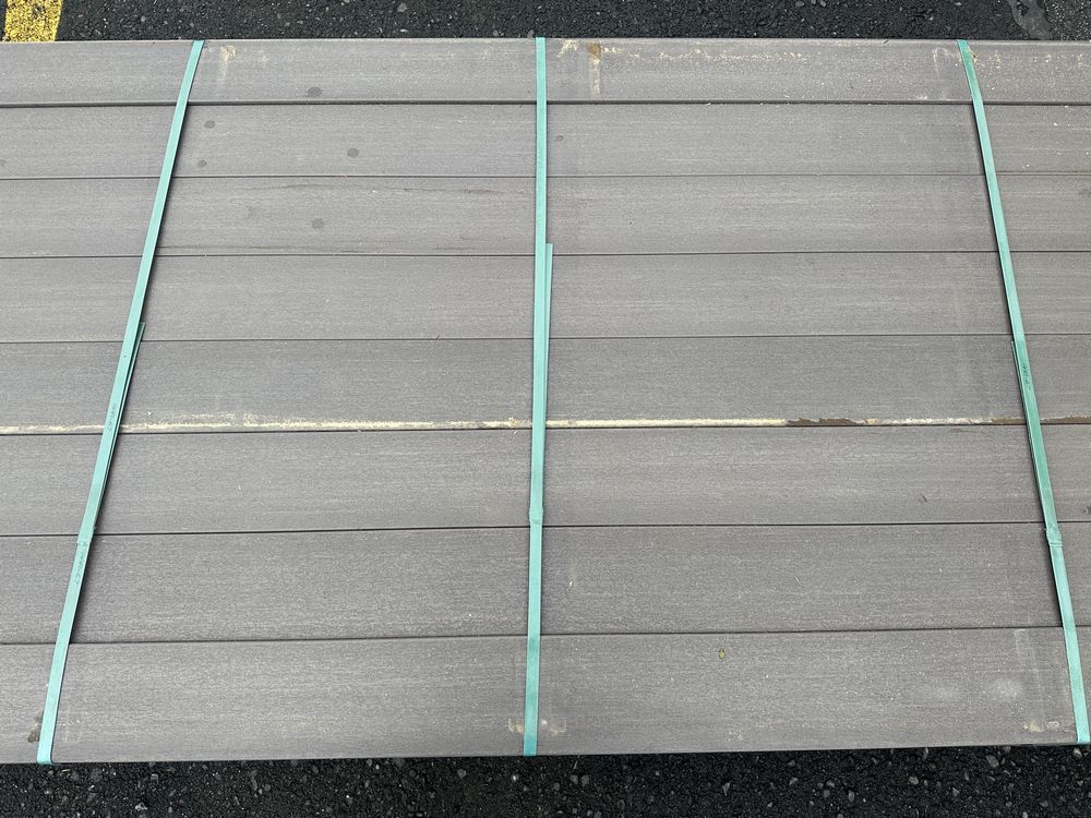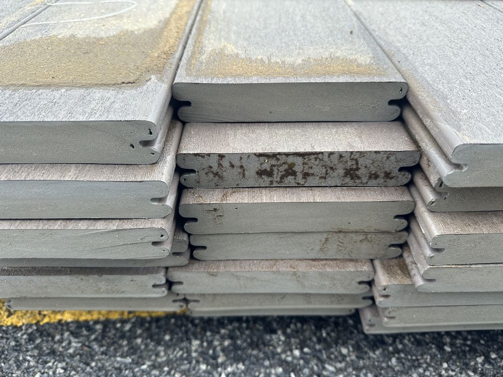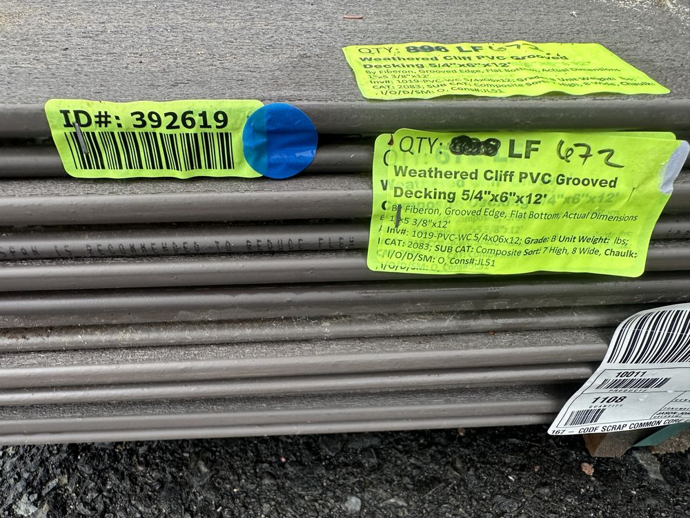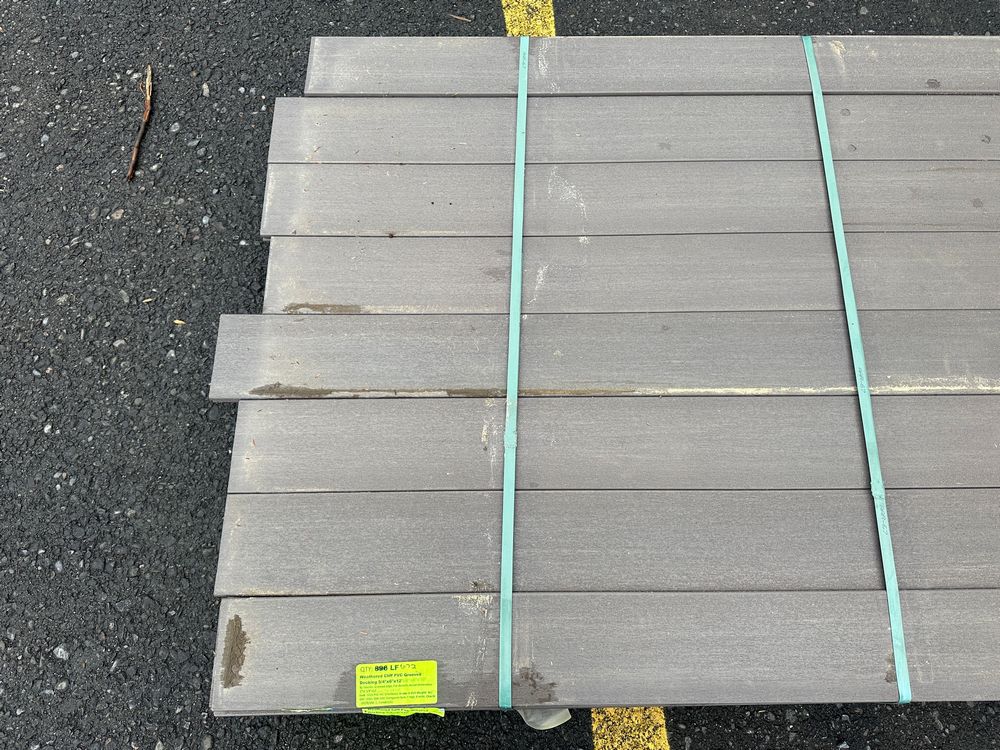 Weathered Cliff PVC Grooved Decking 5/4"x6"x12'. By Fiberon, 56 Boards Total, Grooved Edge, Flat Bottom, Actual Dimensions 1"x5 3/8"x12' Grade: B,This is a liquidated product. The Auction Company makes no express or implied representations or warranties of any kind regarding the Product. Any pre-existing retail, wholesale or manufacturer warranties will not transfer with the sale of this Product unless expressly stated otherwise on this page. The Buyer accepts the Product in as-is condition, with all faults. Weight: x. Sold by: Linear Foot. Sold as: Quantity X Price. Inventory #: 1019-PVC-WC 5/4x06x12