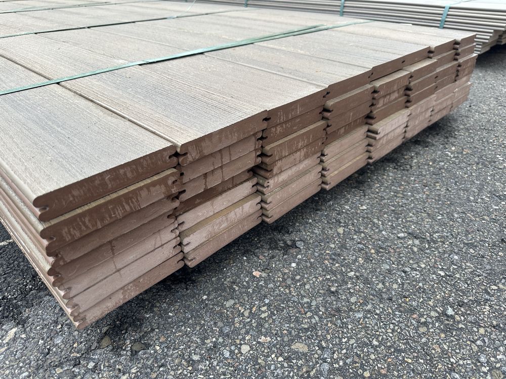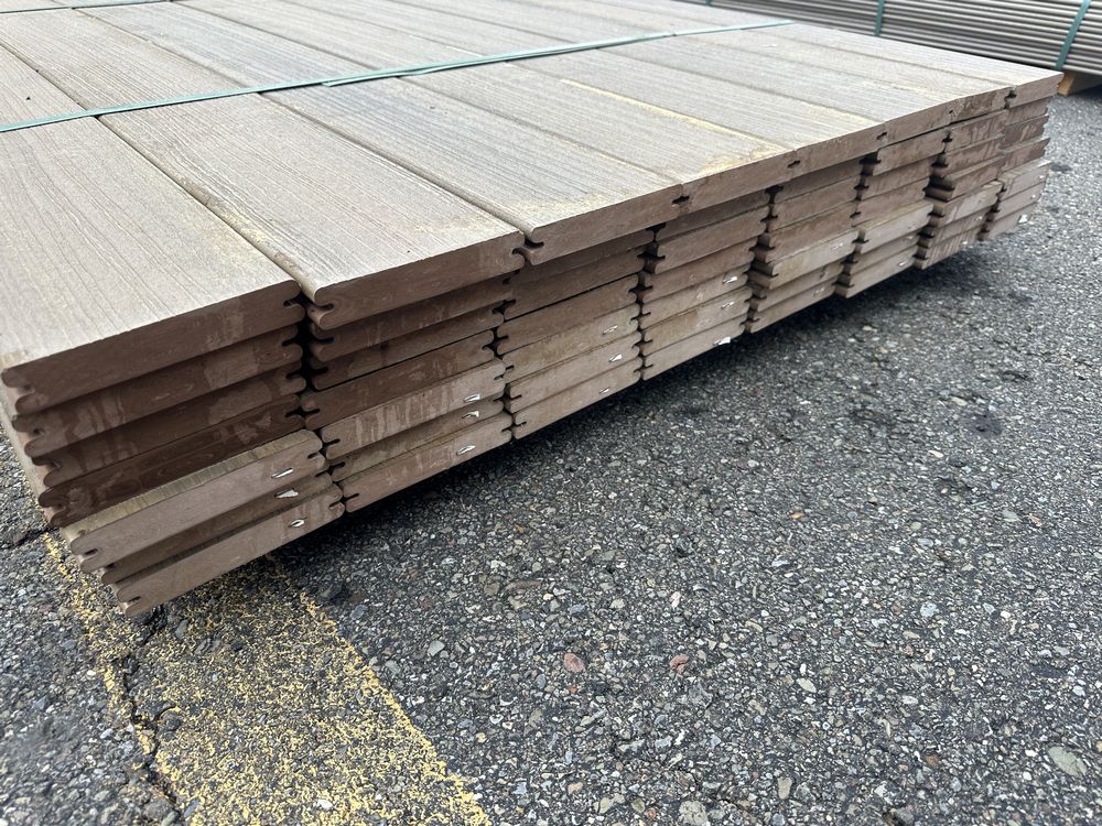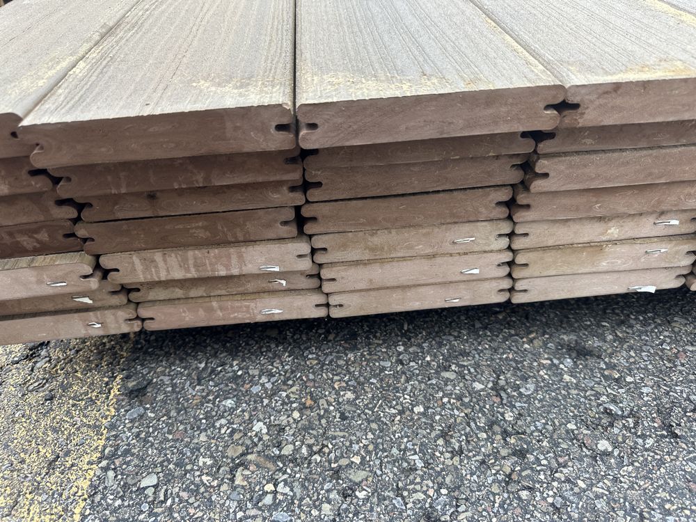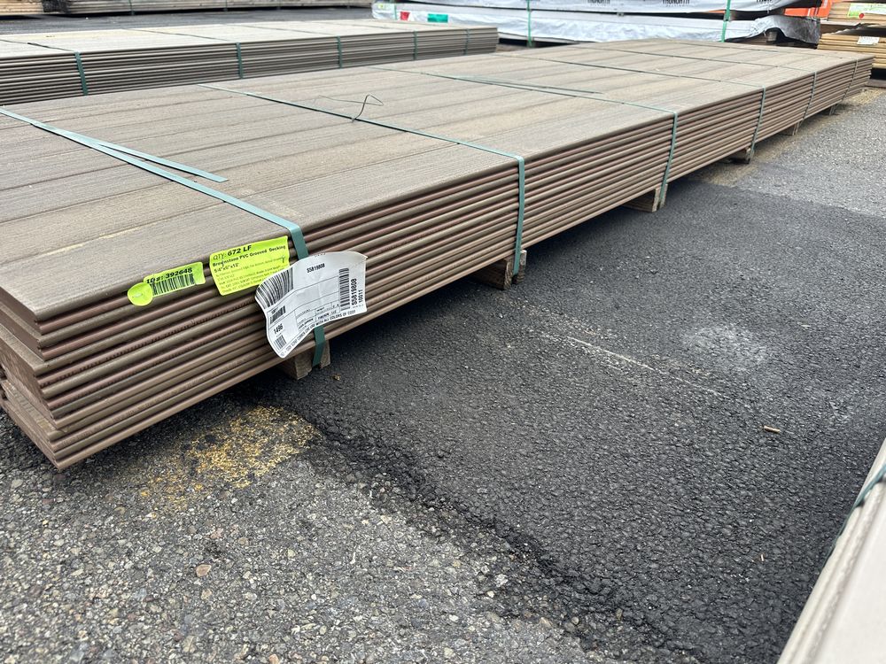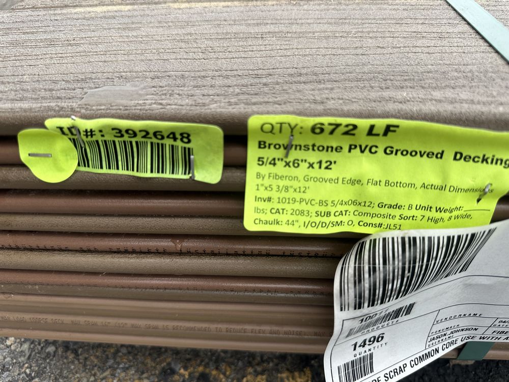 Brownstone PVC Grooved Decking 5/4"x6"x12'. By Fiberon, 56 Total Boards Grooved Edge, Flat Bottom, Actual Dimensions 1"x5 3/8"x12' Grade: B,This is a liquidated product. The Auction Company makes no express or implied representations or warranties of any kind regarding the Product. Any pre-existing retail, wholesale or manufacturer warranties will not transfer with the sale of this Product unless expressly stated otherwise on this page. The Buyer accepts the Product in as-is condition, with all faults. Weight: x. Sold by: Linear Foot. Sold as: Quantity X Price. Inventory #: 1019-PVC-BS 5/4x06x12