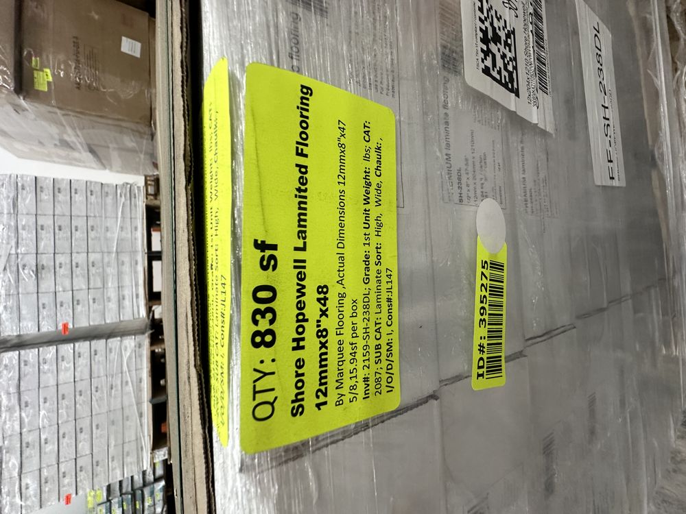 Shore Hopewell Laminated Flooring 12mmx8"x48". By Marquee Flooring, Actual Dimensions 12mmx8"x47 5/8, 15.94sf per box. 52 Boxes Per Pallet, Grade: 1st.,This is a liquidated product. The Auction Company makes no express or implied representations or warranties of any kind regarding the Product. Any pre-existing retail, wholesale or manufacturer warranties will not transfer with the sale of this Product unless expressly stated otherwise on this page. The Buyer accepts the Product in as-is condition, with all faults. Weight: x. Sold by: Square Foot. Sold as: Quantity X Price. Inventory #: 2159-SH-238DL