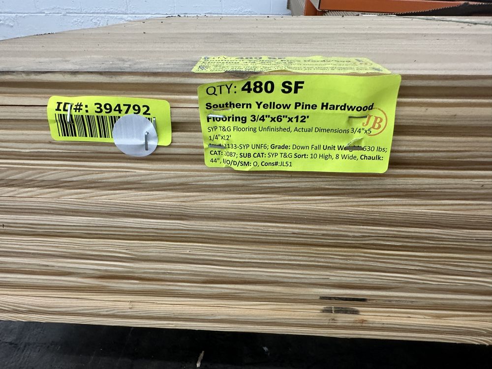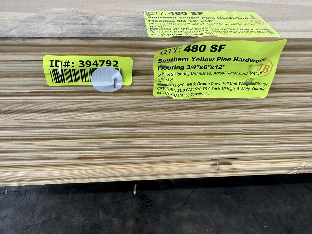 Southern Yellow Pine Hardwood Flooring 3/4"x6"x12'. SYP T&G Flooring Unfinished, Actual Dimensions 3/4"x5 1/4"x12', Grade: Down Fall,This is a liquidated product. The Auction Company makes no express or implied representations or warranties of any kind regarding the Product. Any pre-existing retail, wholesale or manufacturer warranties will not transfer with the sale of this Product unless expressly stated otherwise on this page. The Buyer accepts the Product in as-is condition, with all faults. Weight: 630. Sold by: Square Foot. Sold as: Quantity X Price. Inventory #: 2133-SYP UNF6
