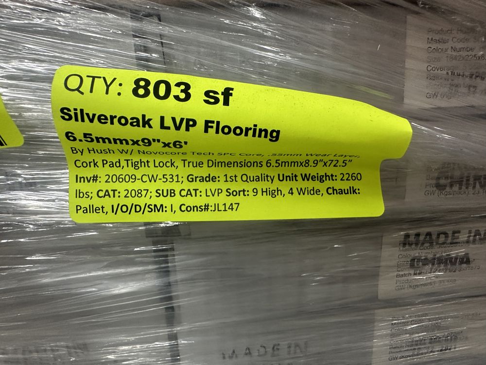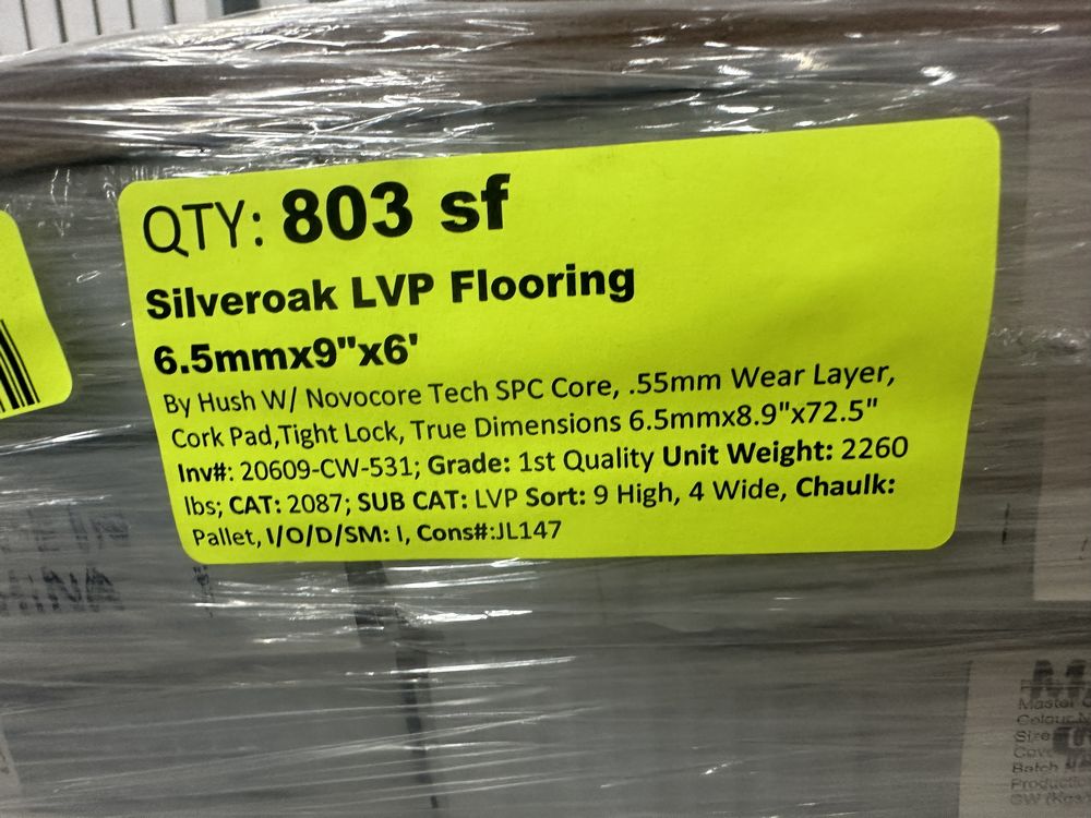 Silveroak LVP Flooring 6.5mmx9"x6'. By hush W/ Novocore Tech SPC Core, .55mm Wear Layer, Cork pad, Tight lock, True Dimensions 6.5mmx8.9"x72.5", 32 boxes, 25 square feet per box, Grade: 1st Quality.,This is a liquidated product. The Auction Company makes no express or implied representations or warranties of any kind regarding the Product. Any pre-existing retail, wholesale or manufacturer warranties will not transfer with the sale of this Product unless expressly stated otherwise on this page. The Buyer accepts the Product in as-is condition, with all faults. Weight: 2260. Sold by: Square Foot. Sold as: Quantity X Price. Inventory #: 20609-CW-531