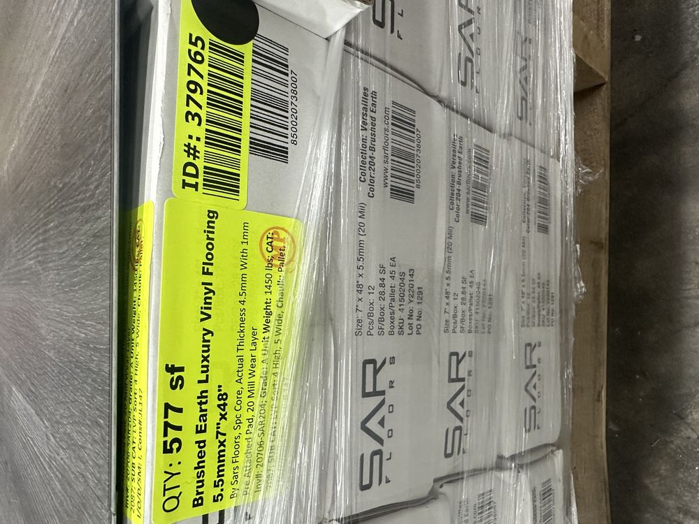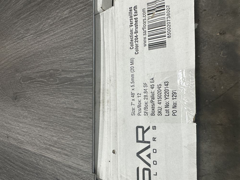 Brushed Earth Luxury Vinyl Flooring 5.5mmx7"x48". By Saras Floors SPC Core, Actual Thickness 4.5mm with 1mm Pre Attaced Pad, 20 Mill Wear Layer, 25 boxes, 28.84 square feet per box, 12 pieces per box, Grade: A.,This is a liquidated product. The Auction Company makes no express or implied representations or warranties of any kind regarding the Product. Any pre-existing retail, wholesale or manufacturer warranties will not transfer with the sale of this Product unless expressly stated otherwise on this page. The Buyer accepts the Product in as-is condition, with all faults. Weight: 1450. Sold by: Square Foot. Sold as: Quantity X Price. Inventory #: 20706-SAR204
