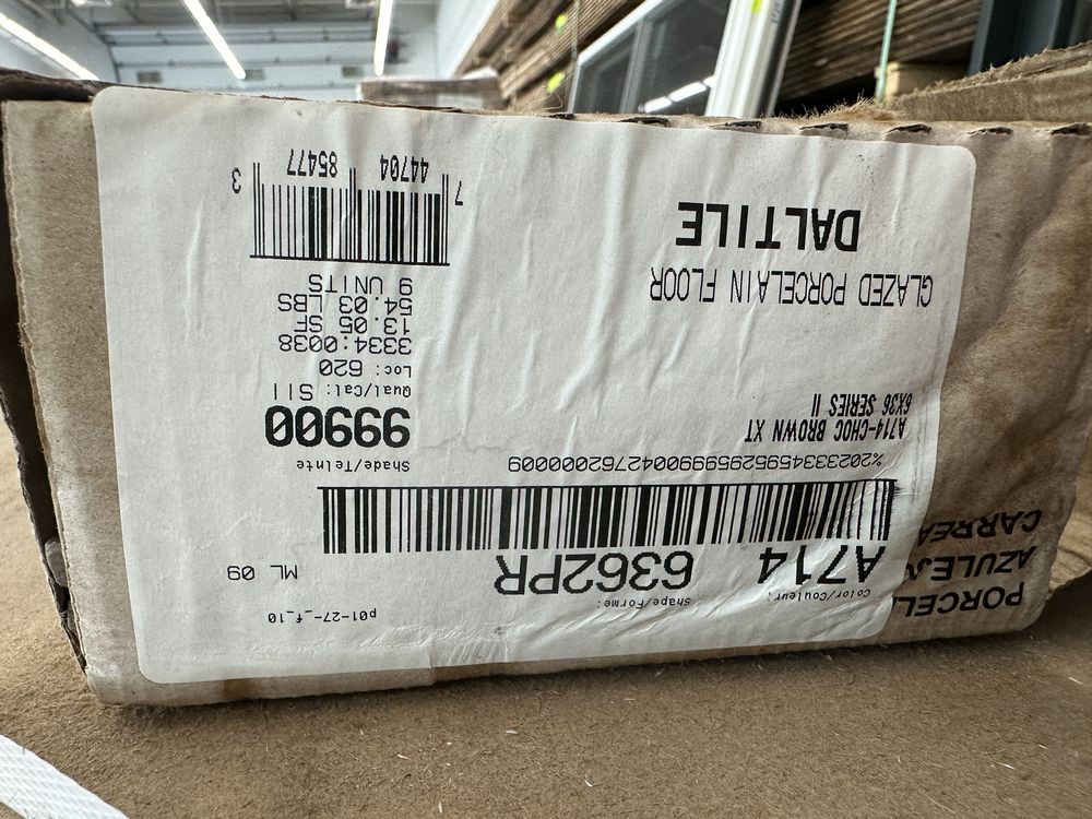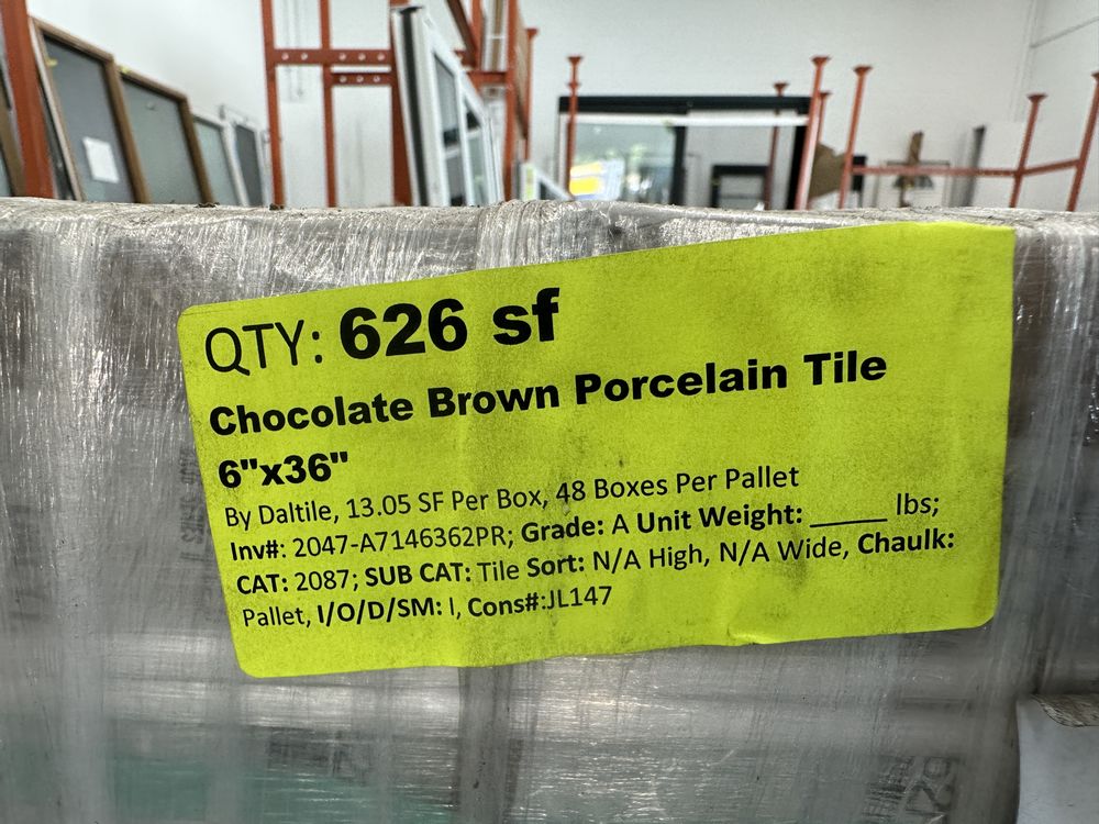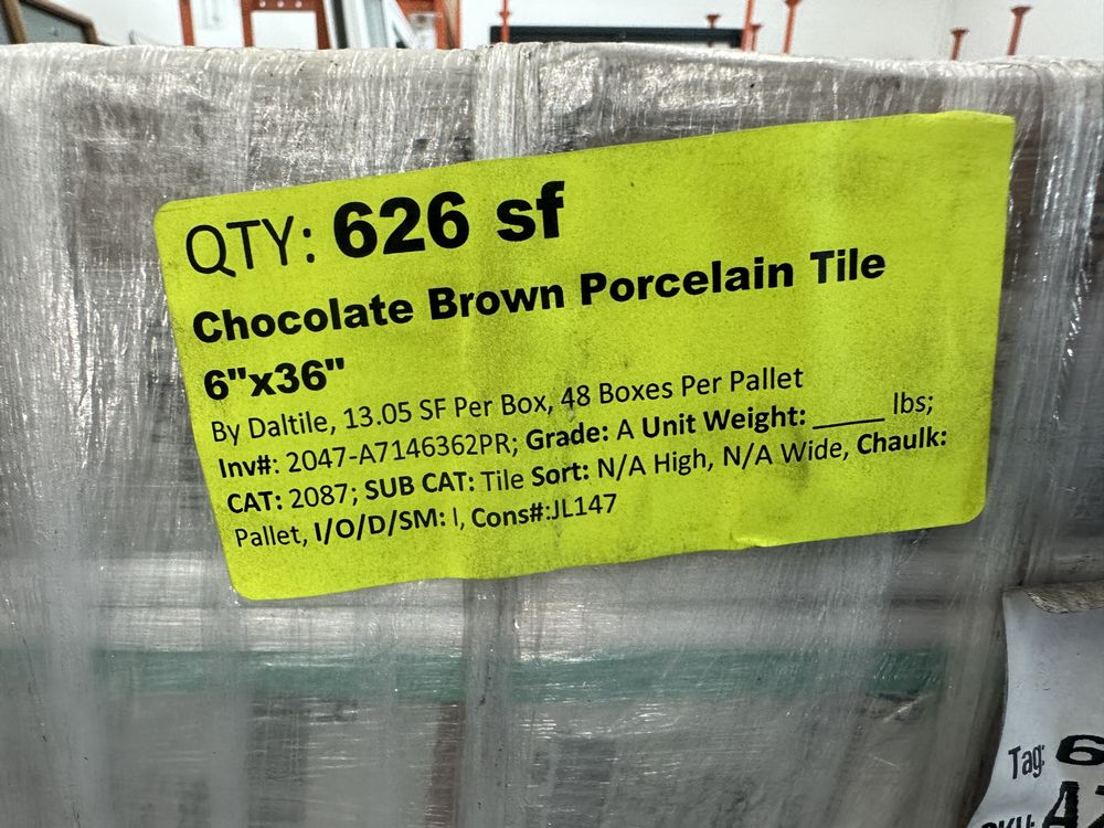 Chocolate Brown Porcelain Tile 6"x36". By Daltile, 13.05 Square Feet per Box, 48 Boxes per Pallet, Grade: A,This is a liquidated product. The Auction Company makes no express or implied representations or warranties of any kind regarding the Product. Any pre-existing retail, wholesale or manufacturer warranties will not transfer with the sale of this Product unless expressly stated otherwise on this page. The Buyer accepts the Product in as-is condition, with all faults. Weight: X. Sold by: Square Foot. Sold as: Quantity X Price. Inventory #: 2047-A7146362PR