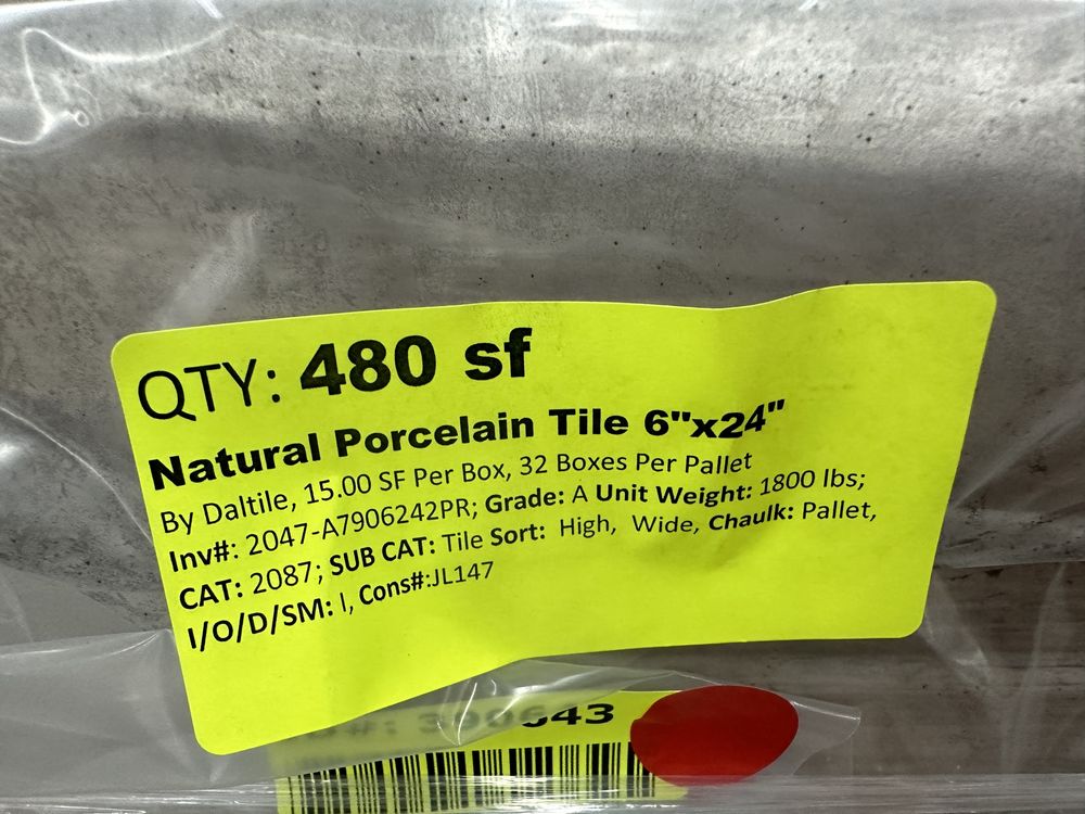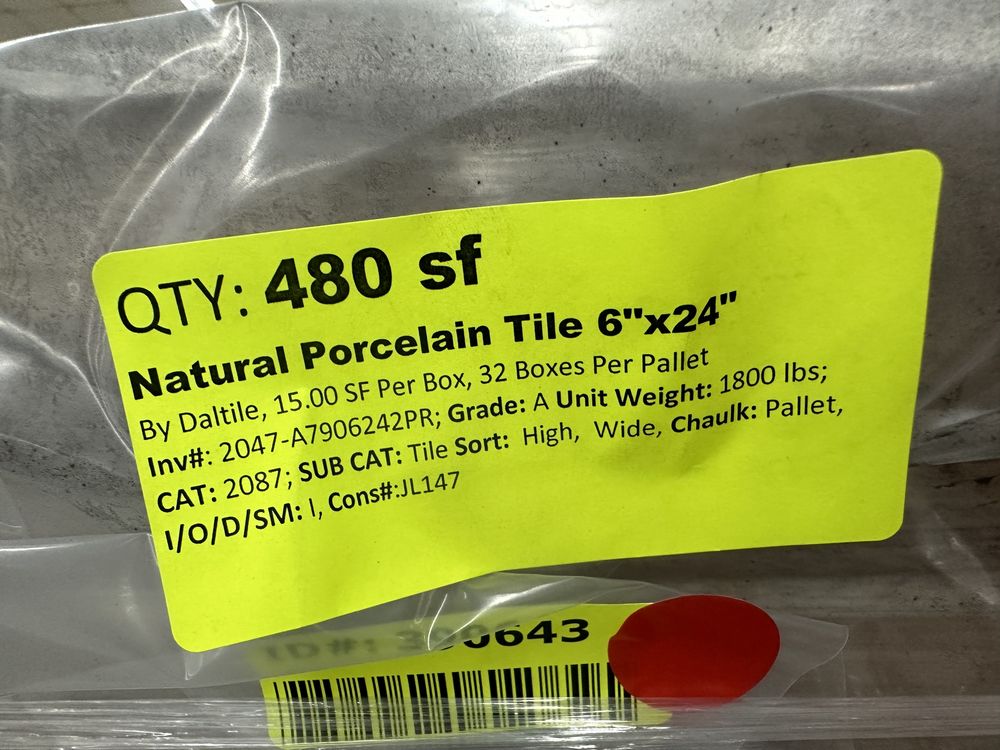 Natural Porcelain Tile 6"x24". By Daltile, 15.00 Square Foot per Box, 32 Boxes Per Pallet, Grade: A,This is a liquidated product. The Auction Company makes no express or implied representations or warranties of any kind regarding the Product. Any pre-existing retail, wholesale or manufacturer warranties will not transfer with the sale of this Product unless expressly stated otherwise on this page. The Buyer accepts the Product in as-is condition, with all faults. Weight: 1,800. Sold by: Square Foot. Sold as: Quantity X Price. Inventory #: 2047-A7906242PR