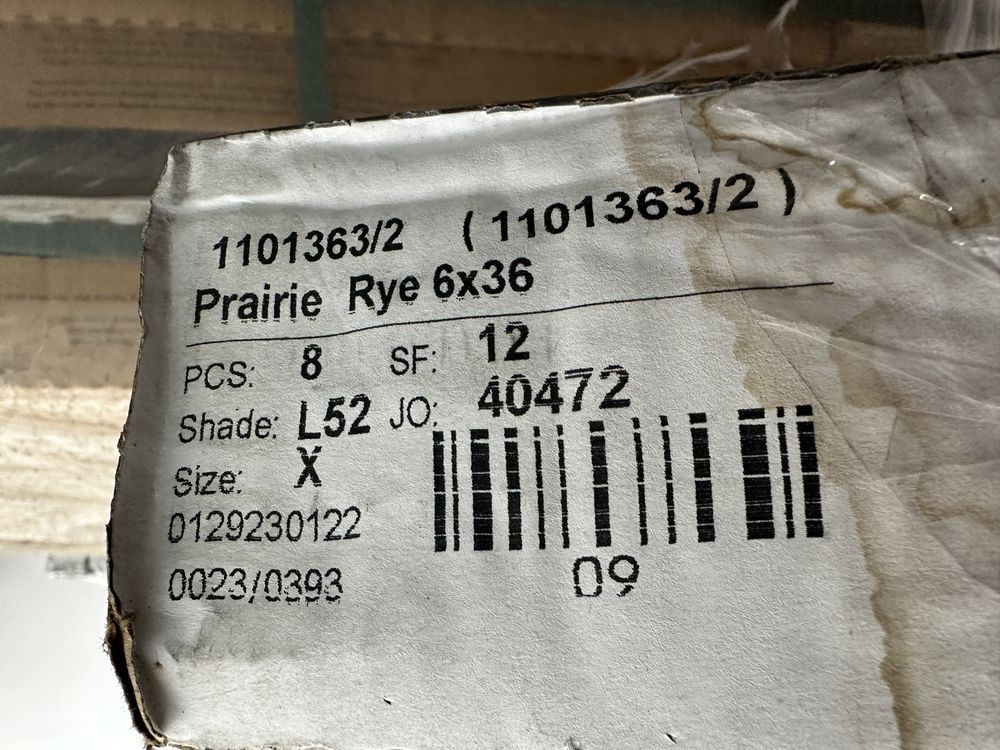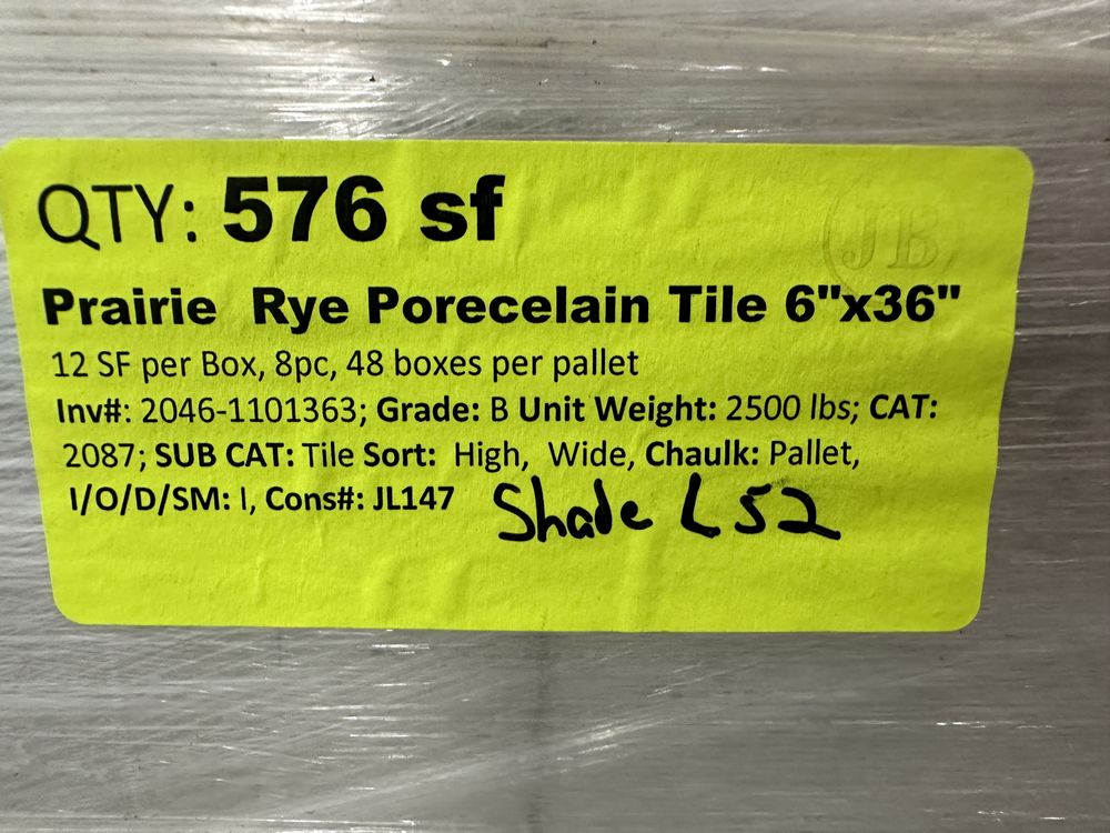 Prairie Rye Porcelain Tile 6"x36" Shade: L52. 12 Square Feet Per Box, 8 PC Per Box, 48 Boxes Per Pallet, Grade: B This is a liquidated product. The Auction Company makes no express or implied representations or warranties of any kind regarding the Product. Any pre-existing retail, wholesale or manufacturer warranties will not transfer with the sale of this Product unless expressly stated otherwise on this page. The Buyer accepts the Product in as-is condition, with all faults. Weight: 2500lbs. Sold by: Square Foot. Sold as: Quantity X Price. Inventory #: 2046-1101363
