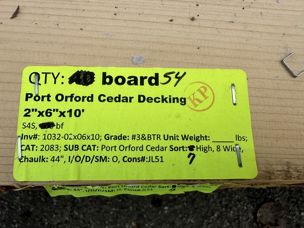 Port Orford Cedar Decking 2"x6"x10'. S4S, Grade: #3&BTR,This is a liquidated product. The Auction Company makes no express or implied representations or warranties of any kind regarding the Product. Any pre-existing retail, wholesale or manufacturer warranties will not transfer with the sale of this Product unless expressly stated otherwise on this page. The Buyer accepts the Product in as-is condition, with all faults. Weight: x. Sold by: Board. Sold as: Quantity X Price. Inventory #: 1032-02x06x10