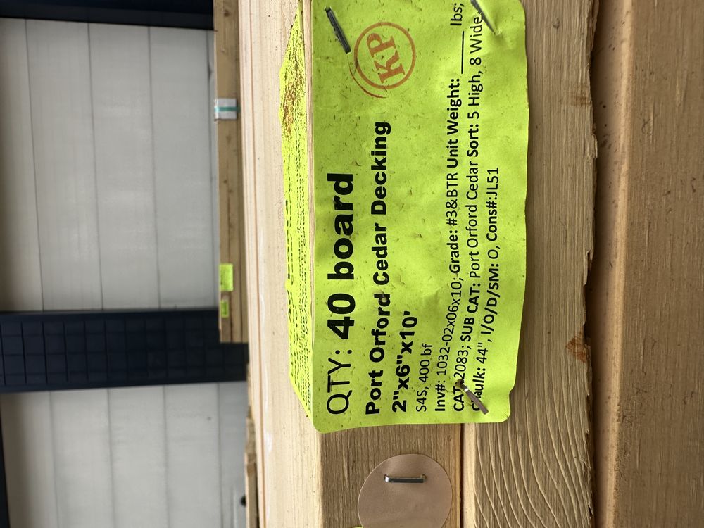 Port Orford Cedar Decking 2"x6"x10'. S4S, 400 Board Feet, Grade: #3&BTR,This is a liquidated product. The Auction Company makes no express or implied representations or warranties of any kind regarding the Product. Any pre-existing retail, wholesale or manufacturer warranties will not transfer with the sale of this Product unless expressly stated otherwise on this page. The Buyer accepts the Product in as-is condition, with all faults. Weight: x. Sold by: Board. Sold as: Quantity X Price. Inventory #: 1032-02x06x10