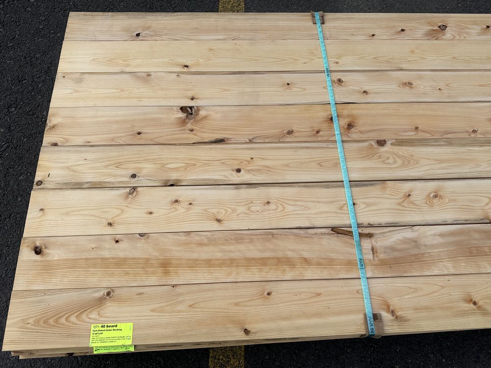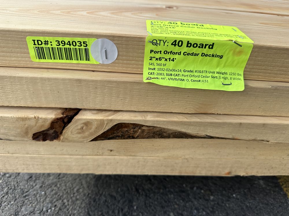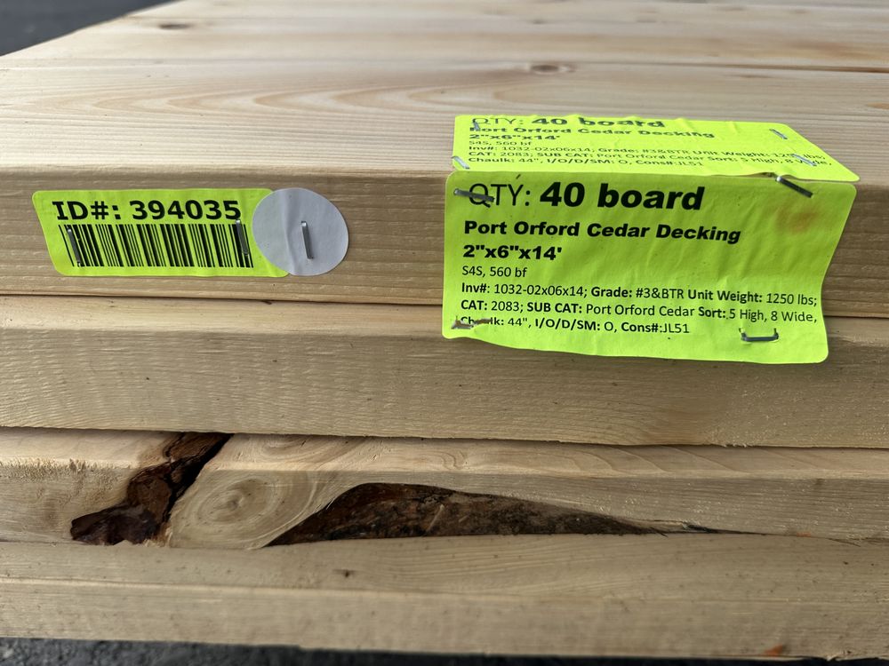 Port Orford Cedar Decking 2"x6"x14'. S4S, 560 Board Foot Grade: #3&BTR,This is a liquidated product. The Auction Company makes no express or implied representations or warranties of any kind regarding the Product. Any pre-existing retail, wholesale or manufacturer warranties will not transfer with the sale of this Product unless expressly stated otherwise on this page. The Buyer accepts the Product in as-is condition, with all faults. Weight: 1250. Sold by: Board. Sold as: Quantity X Price. Inventory #: 1032-02x06x14