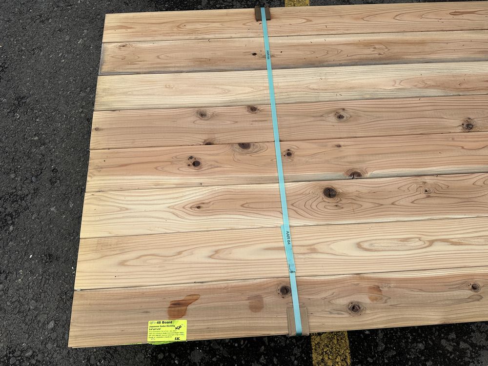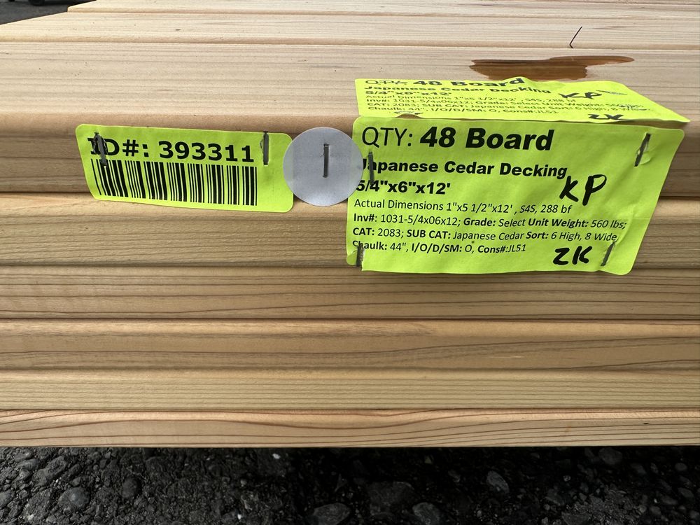Japanese Cedar Decking 5/4"x6"x12'. Actual Dimensions 1"5 1/2"x12', S4S, 288 Board Foot Grade: Select,This is a liquidated product. The Auction Company makes no express or implied representations or warranties of any kind regarding the Product. Any pre-existing retail, wholesale or manufacturer warranties will not transfer with the sale of this Product unless expressly stated otherwise on this page. The Buyer accepts the Product in as-is condition, with all faults. Weight: 560. Sold by: Board. Sold as: Quantity X Price. Inventory #: 1031-5/4x06x12