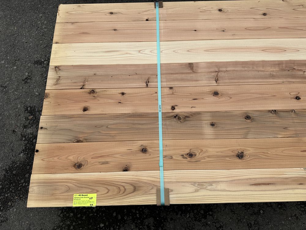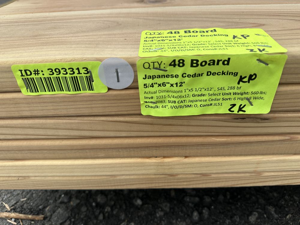 Japanese Cedar Decking 5/4"x6"x12'. Actual Dimensions 1"5 1/2"x12', S4S, 288 Board Foot Grade: Select,This is a liquidated product. The Auction Company makes no express or implied representations or warranties of any kind regarding the Product. Any pre-existing retail, wholesale or manufacturer warranties will not transfer with the sale of this Product unless expressly stated otherwise on this page. The Buyer accepts the Product in as-is condition, with all faults. Weight: 560. Sold by: Board. Sold as: Quantity X Price. Inventory #: 1031-5/4x06x12