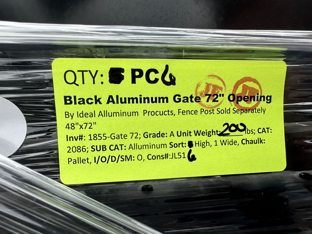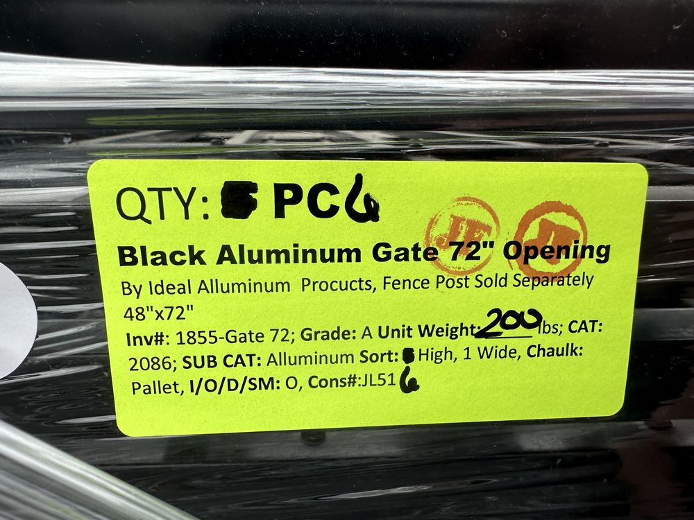 Black Aluminum Gate 72" Opening. By Ideal Alluminum Procucts, Fence Post Sold Separetley 48"x72" Grade: A,This is a liquidated product. The Auction Company makes no express or implied representations or warranties of any kind regarding the Product. Any pre-existing retail, wholesale or manufacturer warranties will not transfer with the sale of this Product unless expressly stated otherwise on this page. The Buyer accepts the Product in as-is condition, with all faults. Weight: 200. Sold by: Piece. Sold as: Quantity X Price. Inventory #: 1855-Gate 72