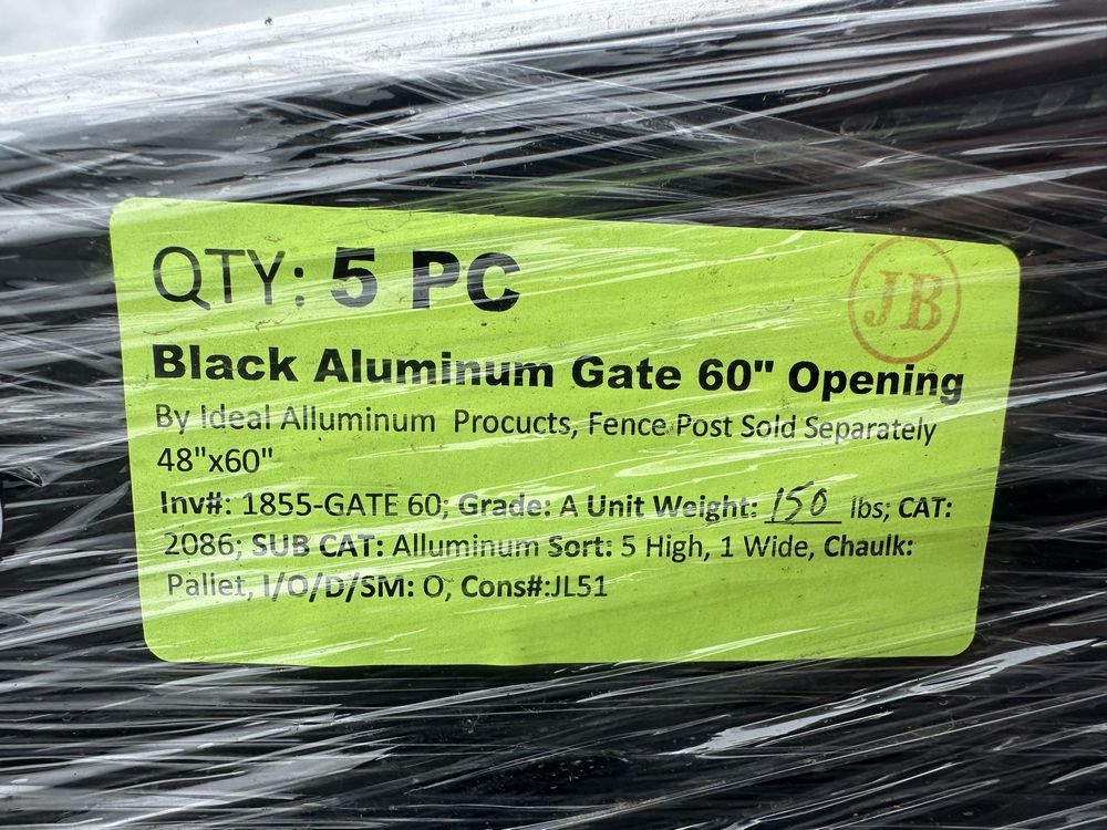 Black Aluminum Gate 60" Opening. By Ideal Alluminum Procucts, Fence Post Sold Separetley 48"x60" Grade: A,This is a liquidated product. The Auction Company makes no express or implied representations or warranties of any kind regarding the Product. Any pre-existing retail, wholesale or manufacturer warranties will not transfer with the sale of this Product unless expressly stated otherwise on this page. The Buyer accepts the Product in as-is condition, with all faults. Weight: 150. Sold by: Piece. Sold as: Quantity X Price. Inventory #: 1855-GATE 60