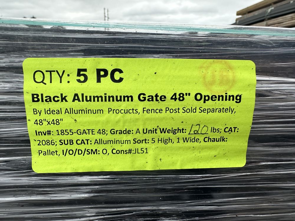 Black Aluminum Gate 48" Opening. By Ideal Alluminum Procucts, Fence Post Sold Separetley 48"x48" Grade: A,This is a liquidated product. The Auction Company makes no express or implied representations or warranties of any kind regarding the Product. Any pre-existing retail, wholesale or manufacturer warranties will not transfer with the sale of this Product unless expressly stated otherwise on this page. The Buyer accepts the Product in as-is condition, with all faults. Weight: 120. Sold by: Piece. Sold as: Quantity X Price. Inventory #: 1855-GATE 48