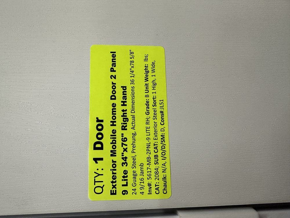 Exterior Mobile Home Door 2 Panel 9 Lite 34"x76" Outswing Left Hand Door. 24 Gauge Steel, Prehung, Actual Dimensions 36 1/4"x78 5/8", 4 9/16 Jamb Grade: B,This is a liquidated product. The Auction Company makes no express or implied representations or warranties of any kind regarding the Product. Any pre-existing retail, wholesale or manufacturer warranties will not transfer with the sale of this Product unless expressly stated otherwise on this page. The Buyer accepts the Product in as-is condition, with all faults. Weight: 75. Sold by: Door. Sold as: Quantity X Price. Inventory #: 5617-MB-2PNL-9 LITE RH