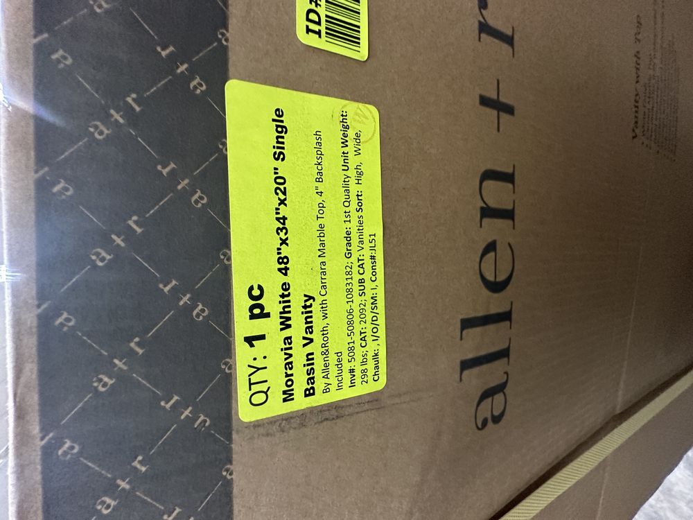 Moravia White 48"x34"x20" Single Basin Vanity. By Allen&Roth, With Carrara Marble Top, 4" Backsplash Included Grade: 1st,This is a liquidated product. Any pre-existing retail, wholesale or manufacturer warranties will not transfer with the sale of this Product unless expressly stated otherwise. Weight: 298. Sold by: Piece. Sold as: Quantity X Price. Inventory #: 5081-50806-1083182