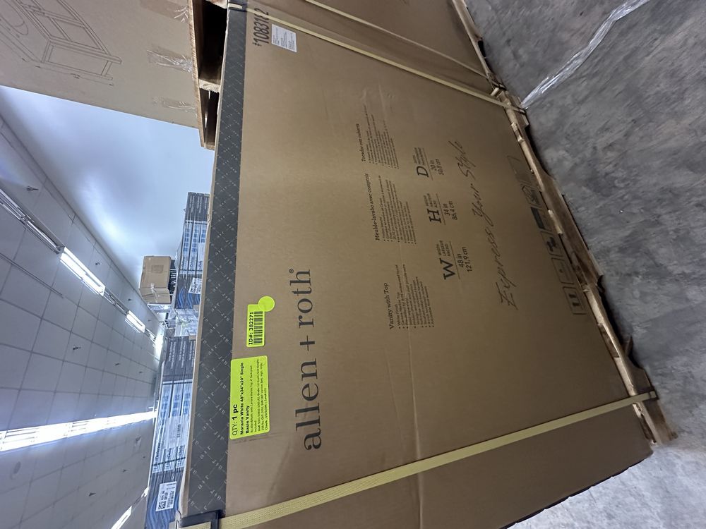 Moravia White 48"x34"x20" Single Basin Vanity. By Allen&Roth, with Carrara Marble Top, 4" Backsplash included, Grade; 1st Quality,This is a liquidated product. Any pre-existing retail, wholesale or manufacturer warranties will not transfer with the sale of this Product unless expressly stated otherwise. Weight: 208. Sold by: Piece. Sold as: Quantity X Price. Inventory #: 5081-50806-1083182