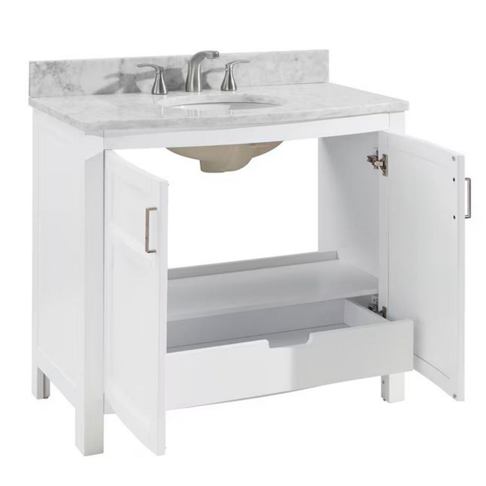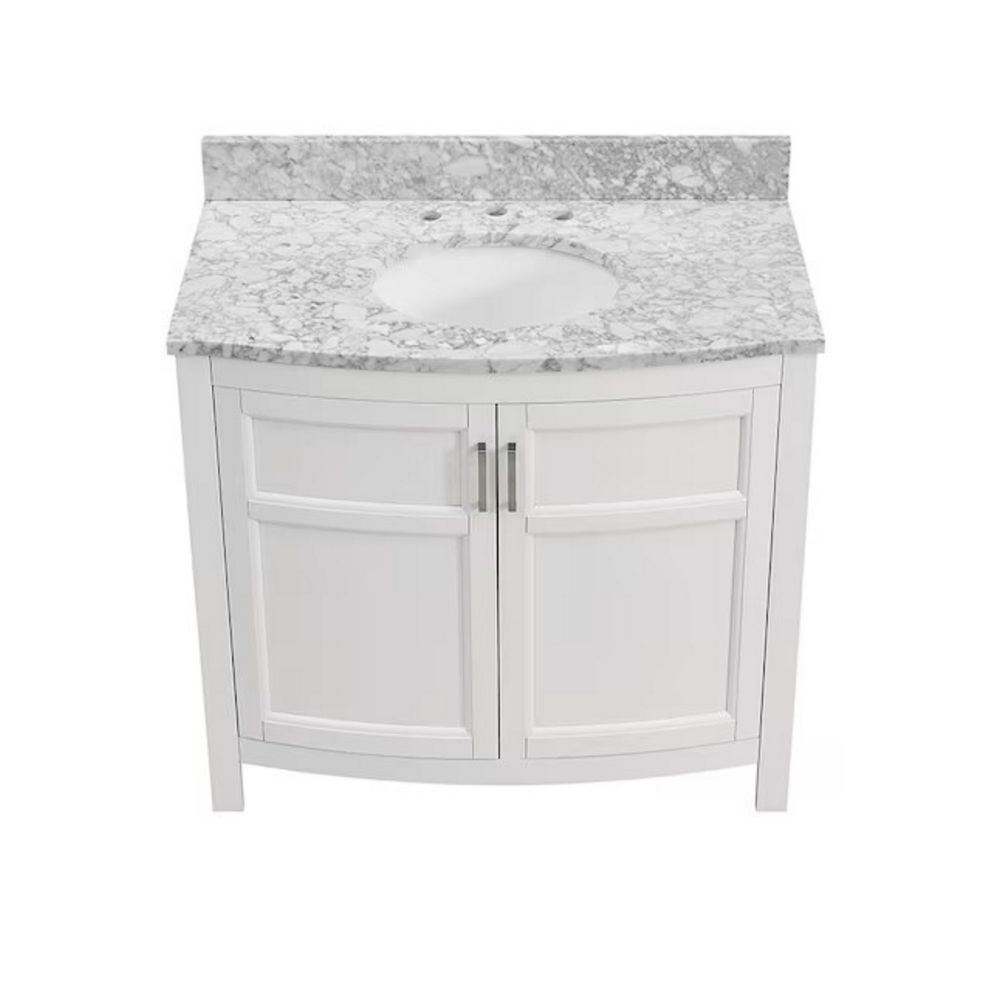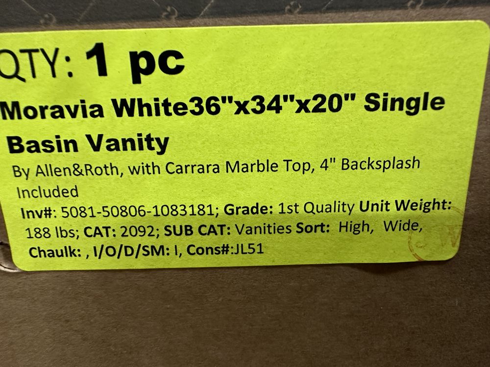 Moravia White 36"x34"x20" Single Basin Vanity. By Allen&Roth, with Carrara Marble Top, 4" Backsplash included, Grade; 1st Quality,This is a liquidated product. Any pre-existing retail, wholesale or manufacturer warranties will not transfer with the sale of this Product unless expressly stated otherwise. Weight: 188. Sold by: Piece. Sold as: Quantity X Price. Inventory #: 5081-50806-1083181