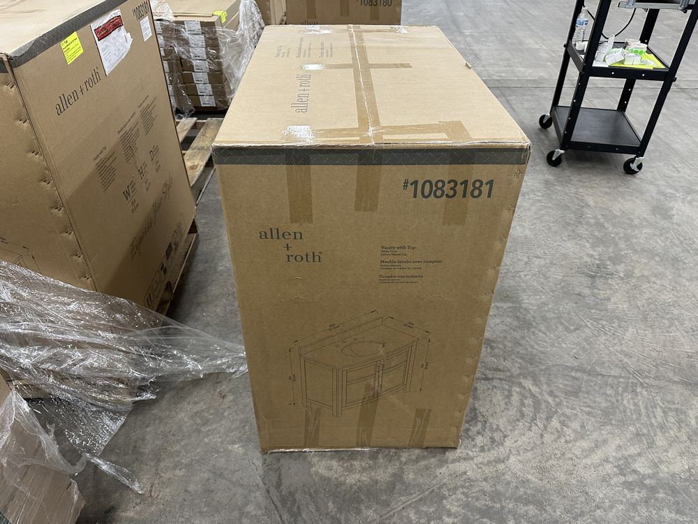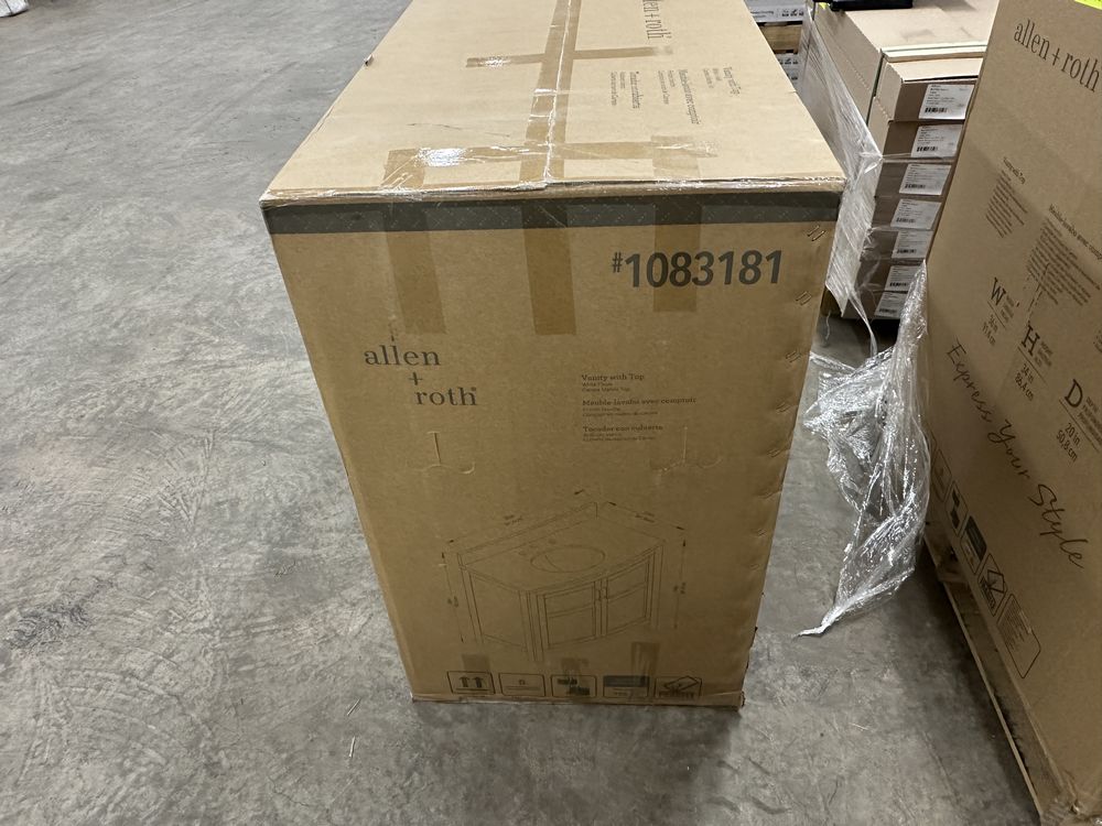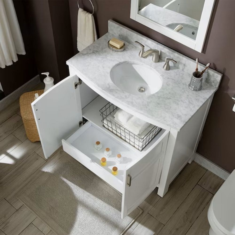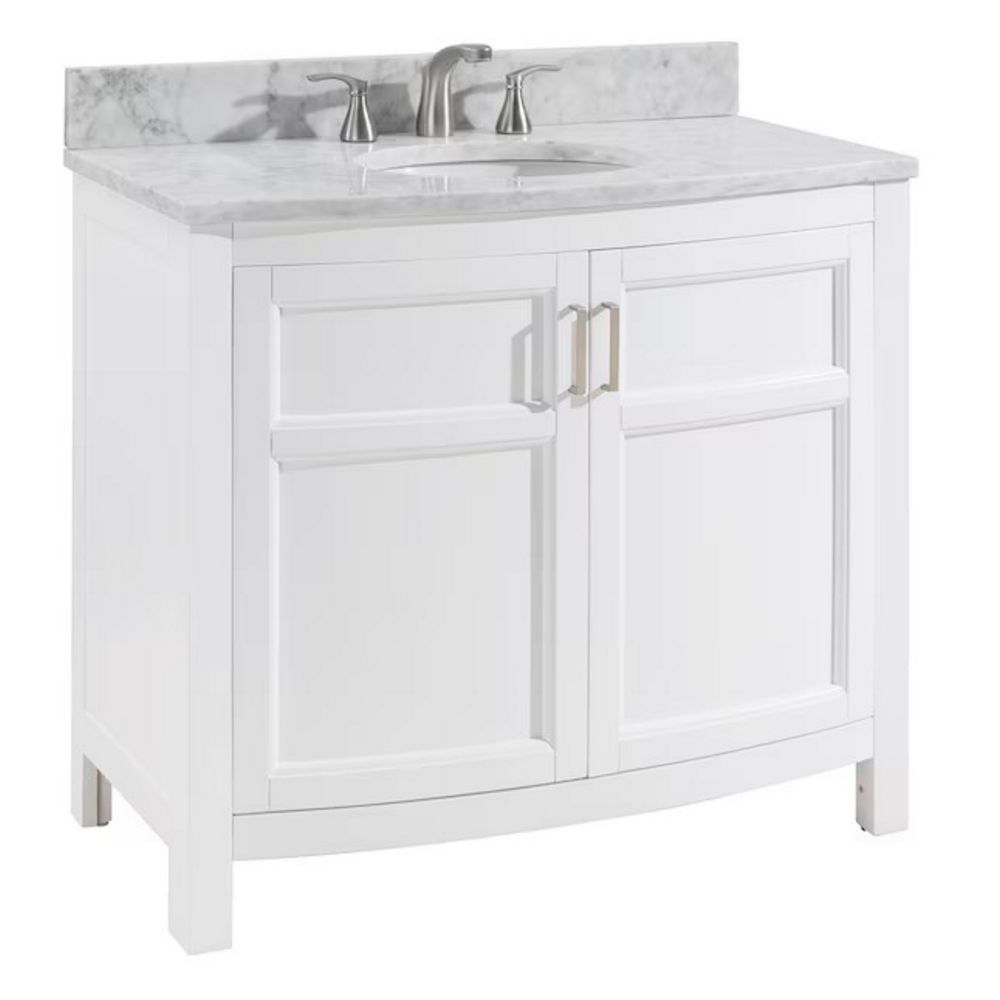 Moravia White 36"x34"x20" Single Basin Vanity. By Allen&Roth, with Carrara Marble Top, 4" Backsplash included, Grade; 1st Quality,This is a liquidated product. Any pre-existing retail, wholesale or manufacturer warranties will not transfer with the sale of this Product unless expressly stated otherwise. Weight: 188. Sold by: Piece. Sold as: Quantity X Price. Inventory #: 5081-50806-1083181