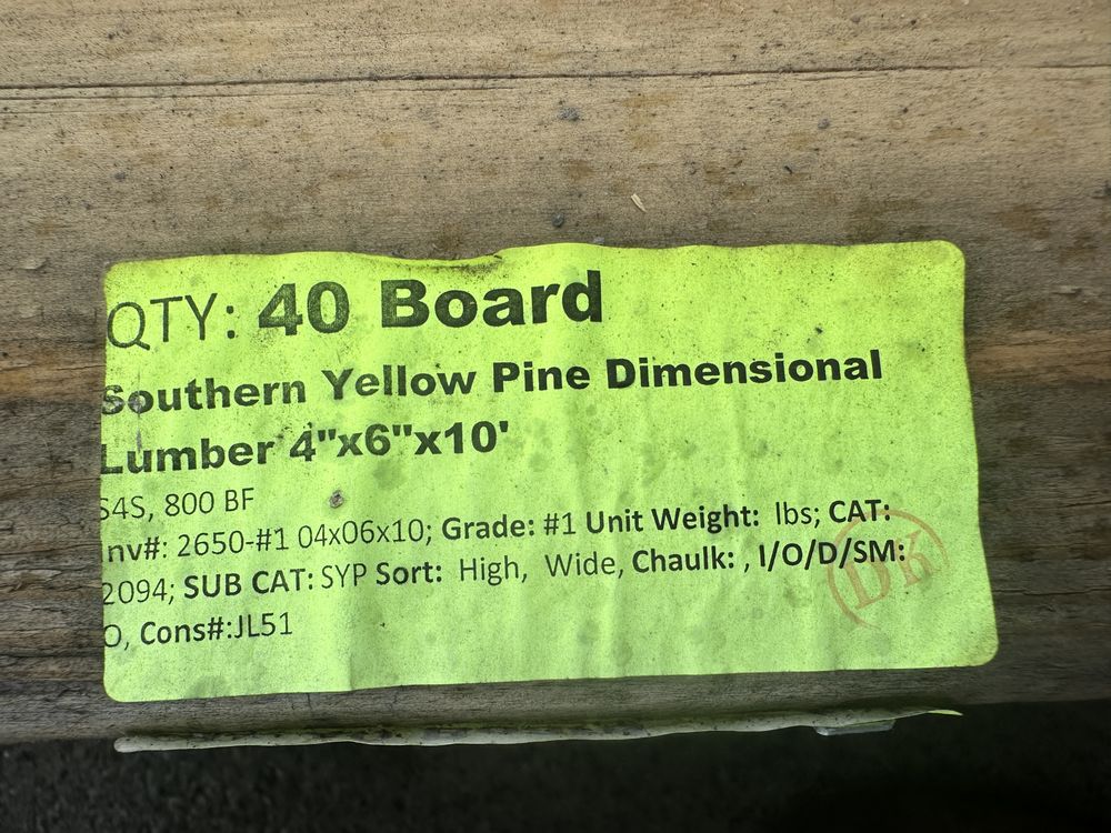 Southern Yellow Pine Dimensional Lumber 4"x6"x10'. S4S, 800 Board Feet, Grade: #1,This is a liquidated product. The Auction Company makes no express or implied representations or warranties of any kind regarding the Product. Any pre-existing retail, wholesale or manufacturer warranties will not transfer with the sale of this Product unless expressly stated otherwise on this page. The Buyer accepts the Product in as-is condition, with all faults. Weight: X. Sold by: Board. Sold as: Quantity X Price. Inventory #: 2650-#1 04x06x10
