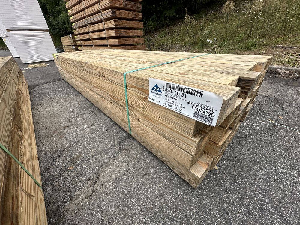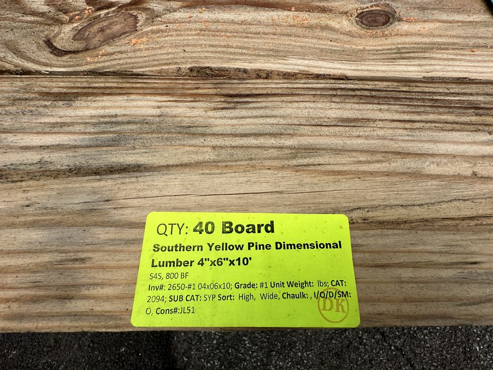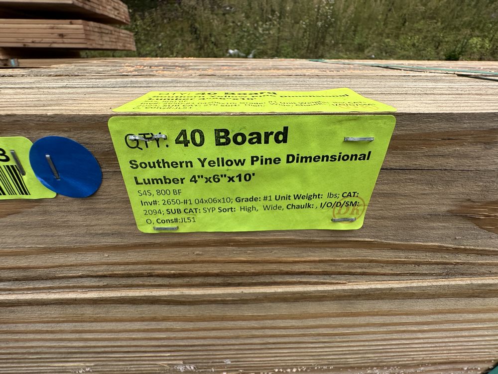 Southern Yellow Pine Dimensional Lumber 4"x6"x10'. S4S, 800 board feet, Grade: #1.,This is a liquidated product. The Auction Company makes no express or implied representations or warranties of any kind regarding the Product. Any pre-existing retail, wholesale or manufacturer warranties will not transfer with the sale of this Product unless expressly stated otherwise on this page. The Buyer accepts the Product in as-is condition, with all faults. Weight: X. Sold by: Board. Sold as: Quantity X Price. Inventory #: 2650-#1 04x06x10