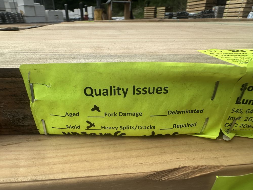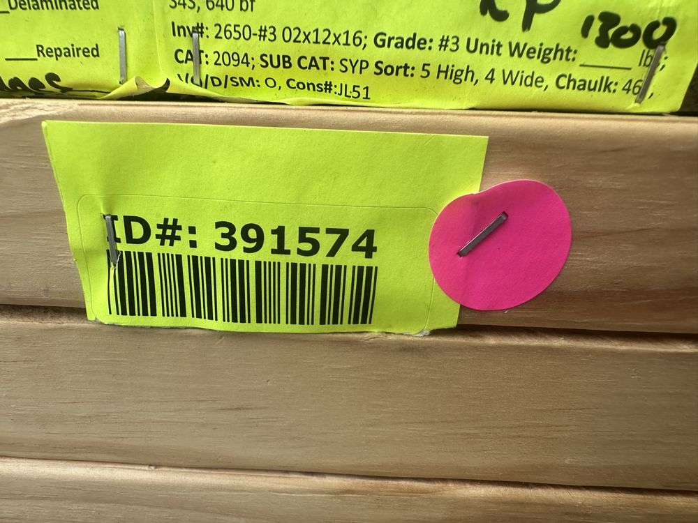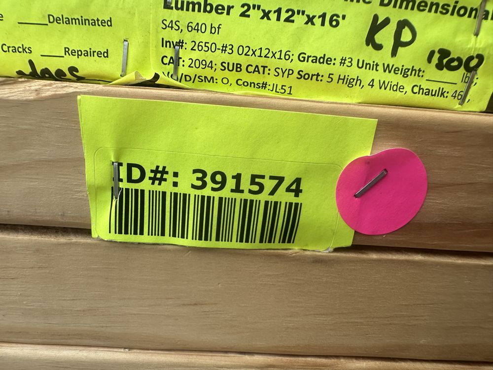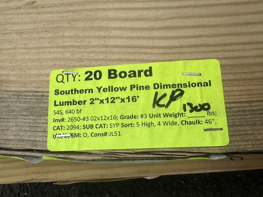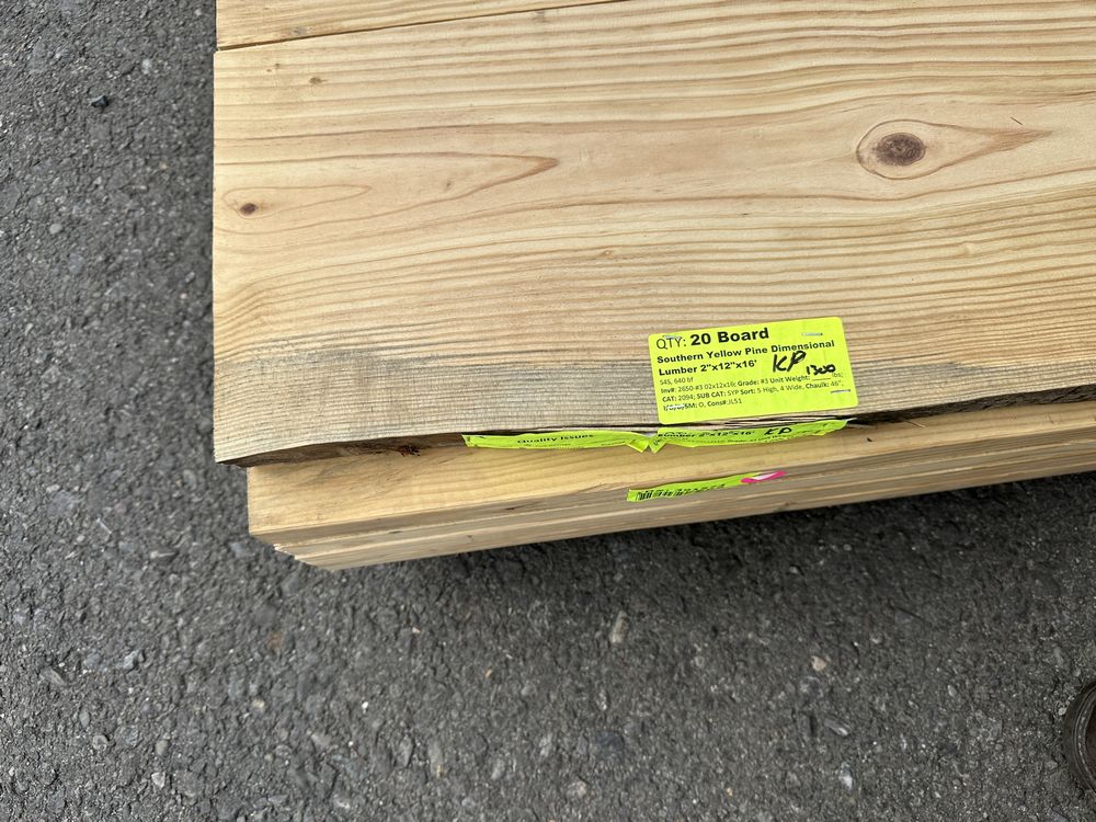 Southern Yellow Pine Dimensional Lumber 2"x12"x16' ** SEE DESCRIPTION**. S4S, 640 Board Foot, Grade: #3 **Fork Damage, Heavy Splits/Cracks, PLEASE SEE PHOTOS**,This is a liquidated product. The Auction Company makes no express or implied representations or warranties of any kind regarding the Product. Any pre-existing retail, wholesale or manufacturer warranties will not transfer with the sale of this Product unless expressly stated otherwise on this page. The Buyer accepts the Product in as-is condition, with all faults. Weight: 1300. Sold by: Board. Sold as: Quantity X Price. Inventory #: 2650-#3 02x12x16