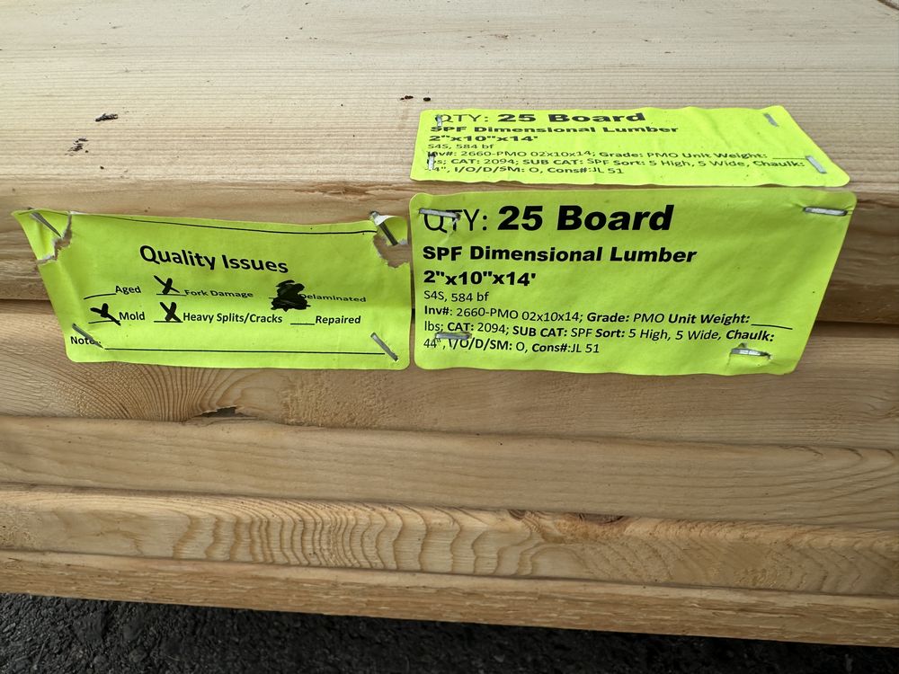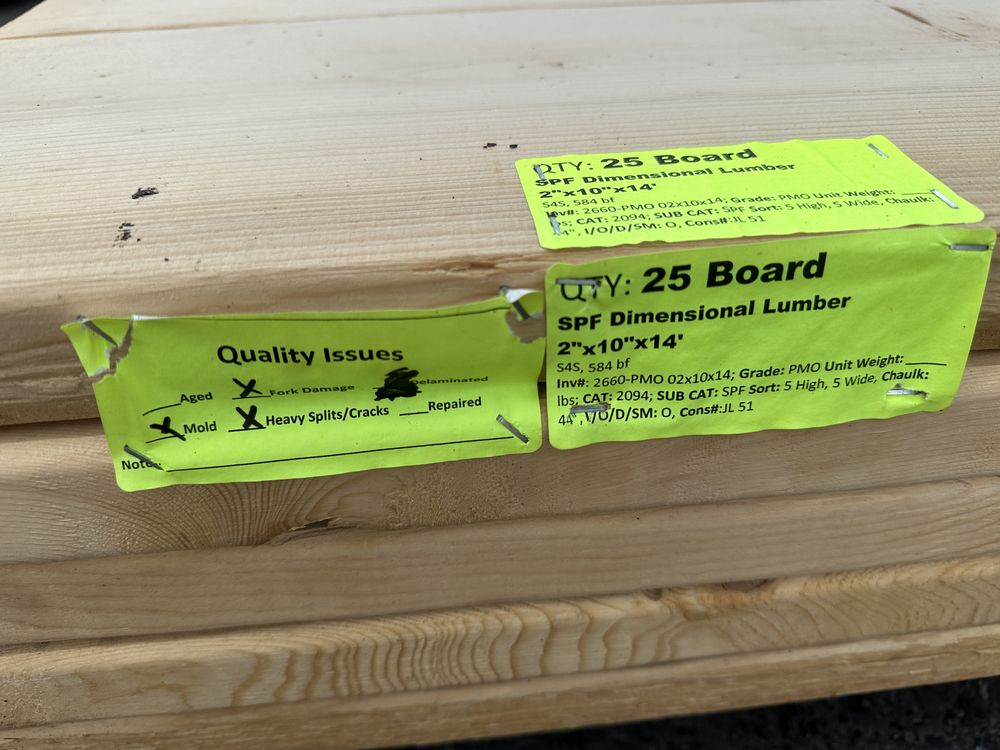 SPF Dimensional Lumber 2"x10"x14' **SEE DESCRIPTION**. S4S, 584 Board Foot Grade: PMO **Fork Damage, Heavy Splits/Cracks, Mold**,This is a liquidated product. The Auction Company makes no express or implied representations or warranties of any kind regarding the Product. Any pre-existing retail, wholesale or manufacturer warranties will not transfer with the sale of this Product unless expressly stated otherwise on this page. The Buyer accepts the Product in as-is condition, with all faults. Weight: x. Sold by: Board. Sold as: Quantity X Price. Inventory #: 2660-PMO 02x10x14