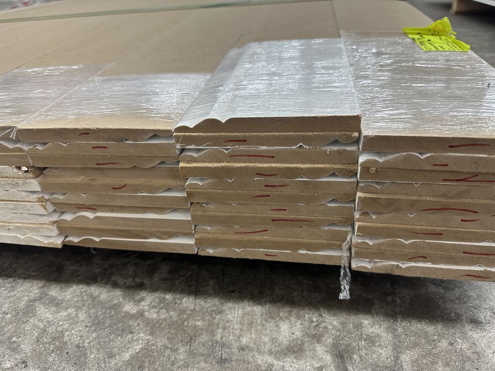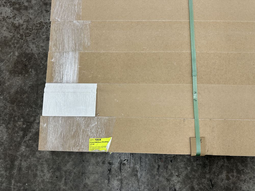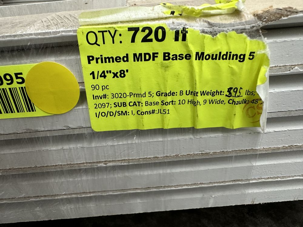 Primed MDF Base Moulding 5 1/4"x8'. 90 Piece Grade: B,This is a liquidated product. The Auction Company makes no express or implied representations or warranties of any kind regarding the Product. Any pre-existing retail, wholesale or manufacturer warranties will not transfer with the sale of this Product unless expressly stated otherwise on this page. The Buyer accepts the Product in as-is condition, with all faults. Weight: 595. Sold by: Linear Foot. Sold as: Quantity X Price. Inventory #: 3020-Prmd 5