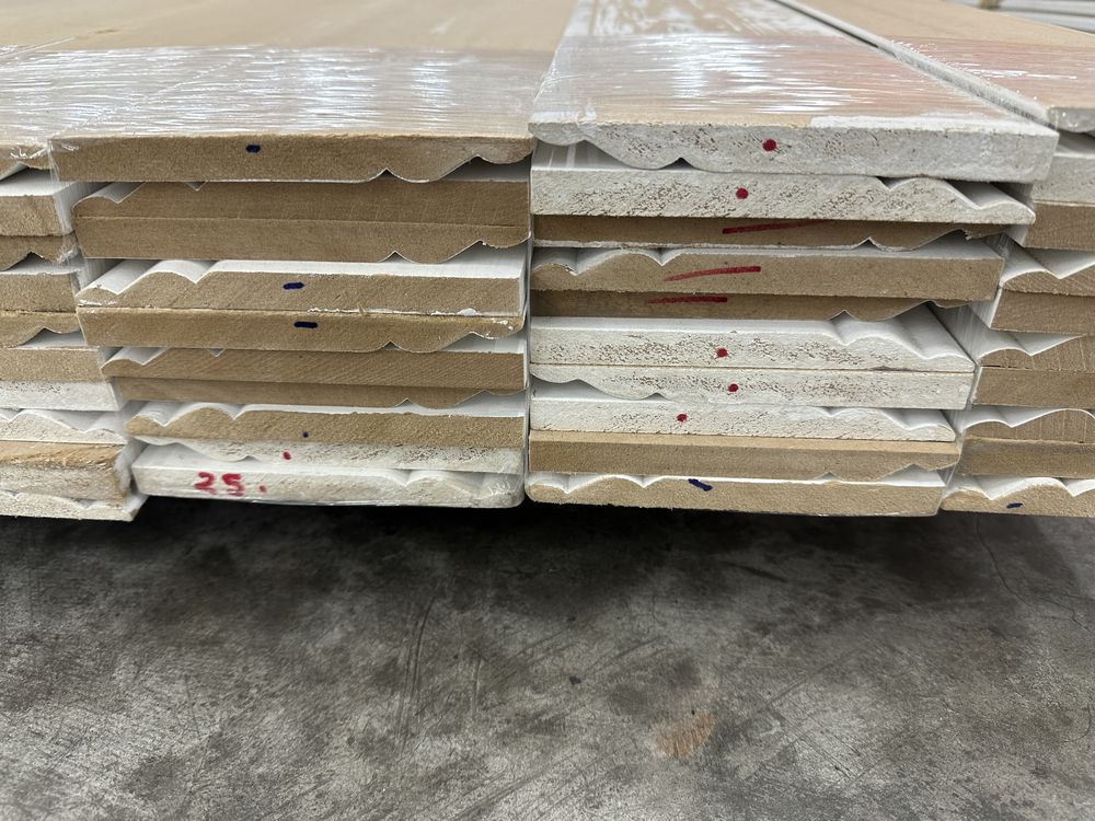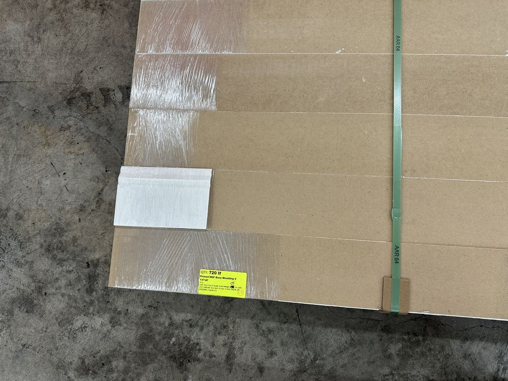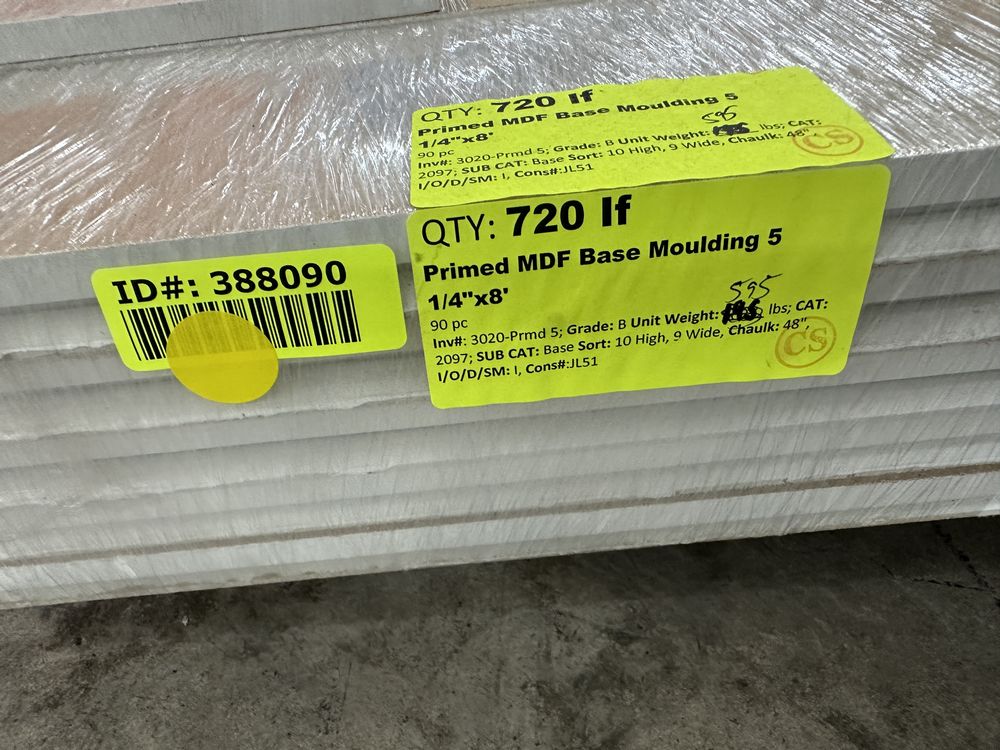 Primed MDF Base Moulding 5 1/4"x8'. 90 Piece Grade: B,This is a liquidated product. The Auction Company makes no express or implied representations or warranties of any kind regarding the Product. Any pre-existing retail, wholesale or manufacturer warranties will not transfer with the sale of this Product unless expressly stated otherwise on this page. The Buyer accepts the Product in as-is condition, with all faults. Weight: 595. Sold by: Linear Foot. Sold as: Quantity X Price. Inventory #: 3020-Prmd 5
