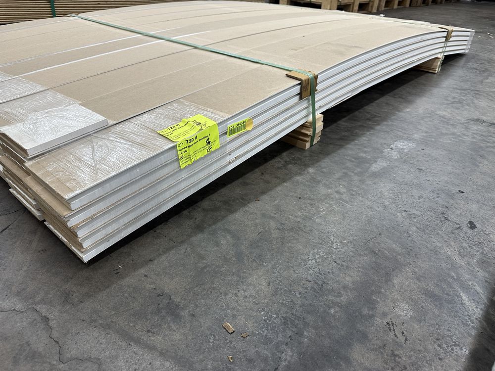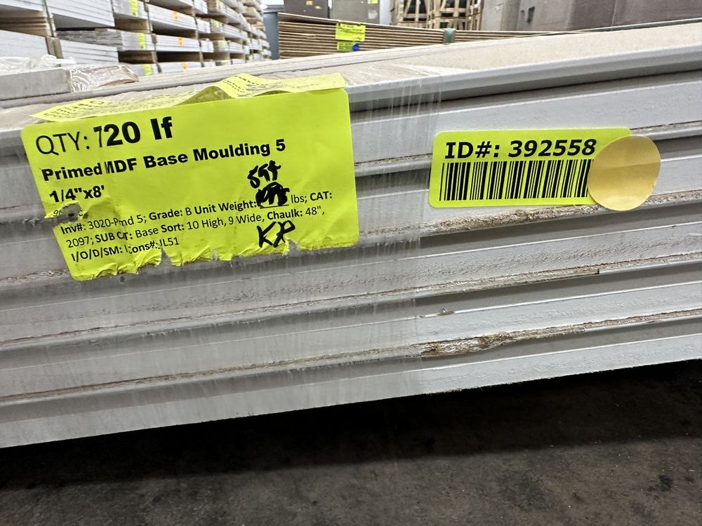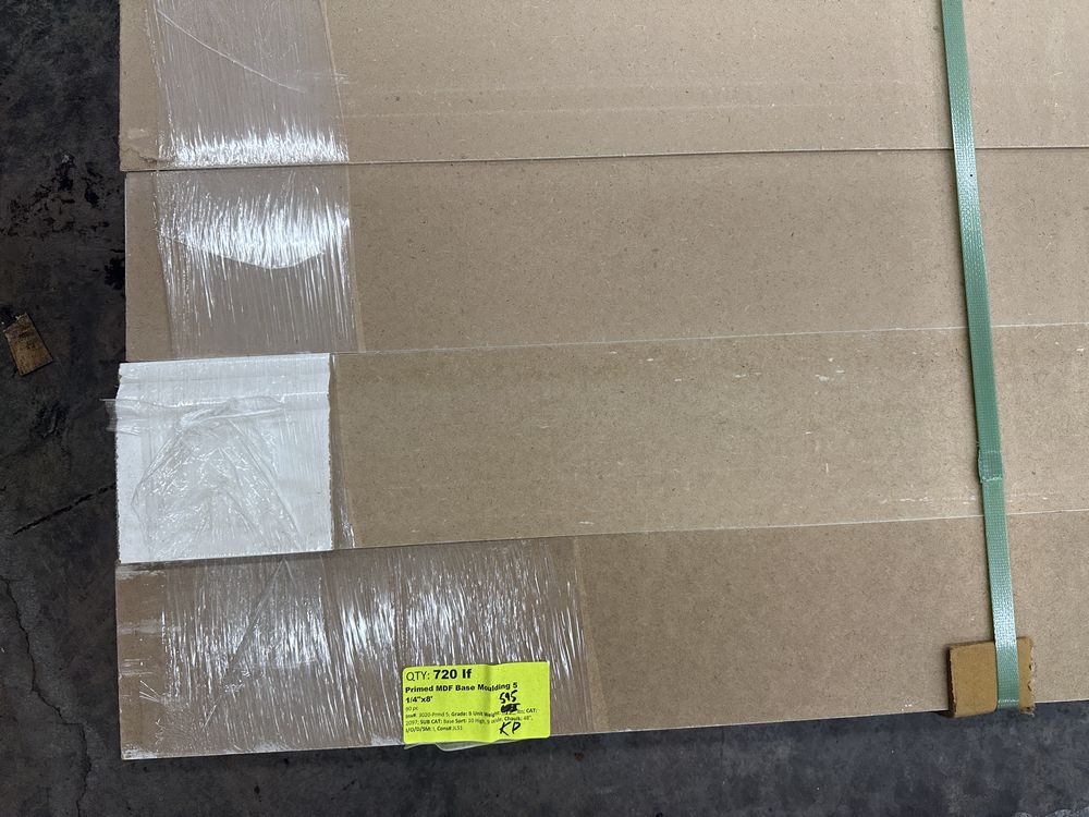 Primed MDF Base Moulding 5 1/4"x8'. 90 Pieces, Grade: B,This is a liquidated product. The Auction Company makes no express or implied representations or warranties of any kind regarding the Product. Any pre-existing retail, wholesale or manufacturer warranties will not transfer with the sale of this Product unless expressly stated otherwise on this page. The Buyer accepts the Product in as-is condition, with all faults. Weight: 595. Sold by: Linear Foot. Sold as: Quantity X Price. Inventory #: 3020-Prmd 5