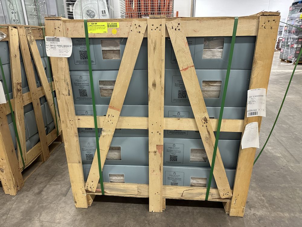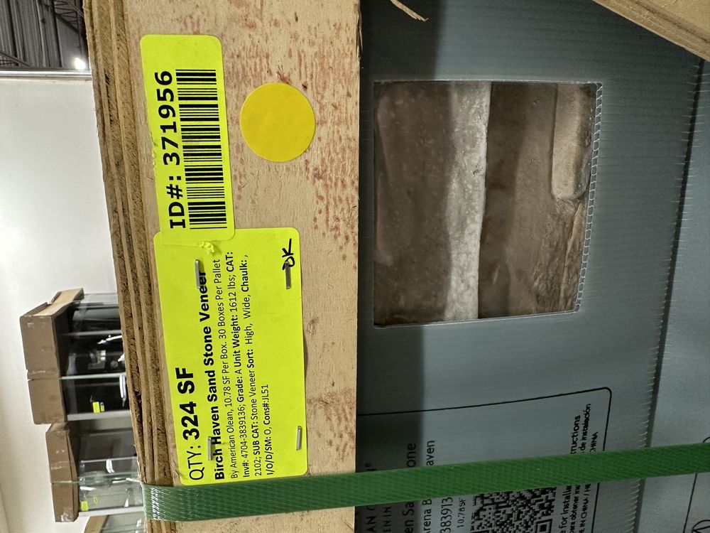 Birch Haven Sand Stone Veneer. By American Olean, 10.78 sf per box, 30 boxes per pallet, Grade: A.,This is a liquidated product. The Auction Company makes no express or implied representations or warranties of any kind regarding the Product. Any pre-existing retail, wholesale or manufacturer warranties will not transfer with the sale of this Product unless expressly stated otherwise on this page. The Buyer accepts the Product in as-is condition, with all faults. Weight: 1612 lbs.. Sold by: Square Foot. Sold as: Quantity X Price. Inventory #: 4704-3839136