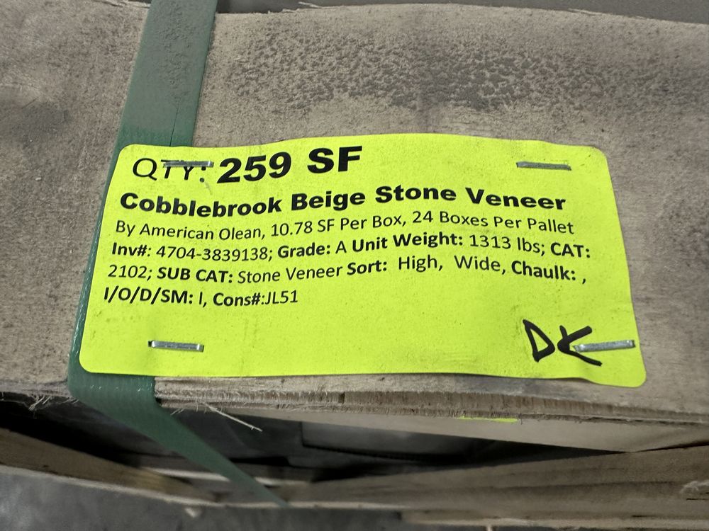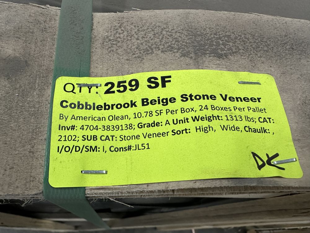 Cobblebrook Beige Stone Veneer. By American Olean, 10.78 SF Per Box, 24 Boes Per Pallet Grade; A,This is a liquidated product. The Auction Company makes no express or implied representations or warranties of any kind regarding the Product. Any pre-existing retail, wholesale or manufacturer warranties will not transfer with the sale of this Product unless expressly stated otherwise on this page. The Buyer accepts the Product in as-is condition, with all faults. Weight: 1313lbs. Sold by: Square foot. Sold as: Quantity X Price. Inventory #: 4704-3839138