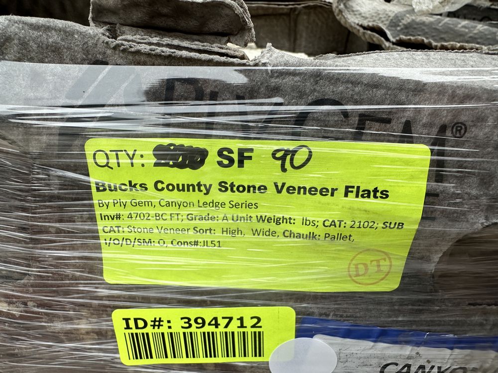 Bucks County Stone Veneer Flats. By Ply Gem, Canyon Ledge Series Grade: A,This is a liquidated product. The Auction Company makes no express or implied representations or warranties of any kind regarding the Product. Any pre-existing retail, wholesale or manufacturer warranties will not transfer with the sale of this Product unless expressly stated otherwise on this page. The Buyer accepts the Product in as-is condition, with all faults. Weight: X. Sold by: Square Foot. Sold as: Quantity X Price. Inventory #: 4702-BC FT