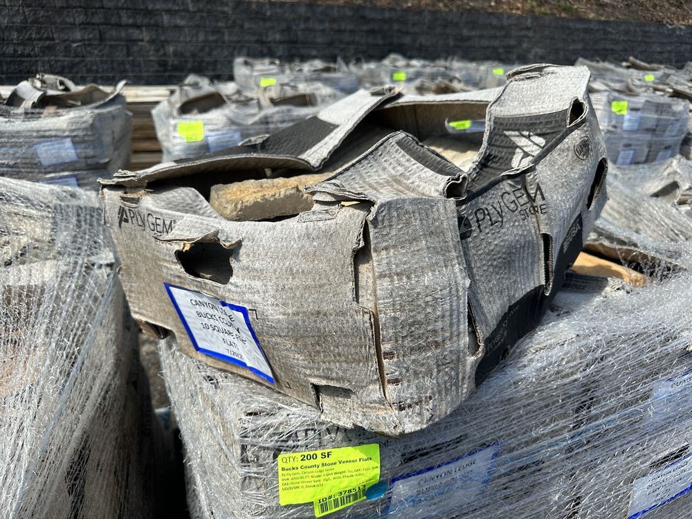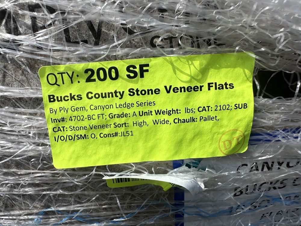 Bucks County Stone Veneer Flats. By Ply Gem, Canyon Ledge Series Grade: A,This is a liquidated product. The Auction Company makes no express or implied representations or warranties of any kind regarding the Product. Any pre-existing retail, wholesale or manufacturer warranties will not transfer with the sale of this Product unless expressly stated otherwise on this page. The Buyer accepts the Product in as-is condition, with all faults. Weight: X. Sold by: Square Foot. Sold as: Quantity X Price. Inventory #: 4702-BC FT